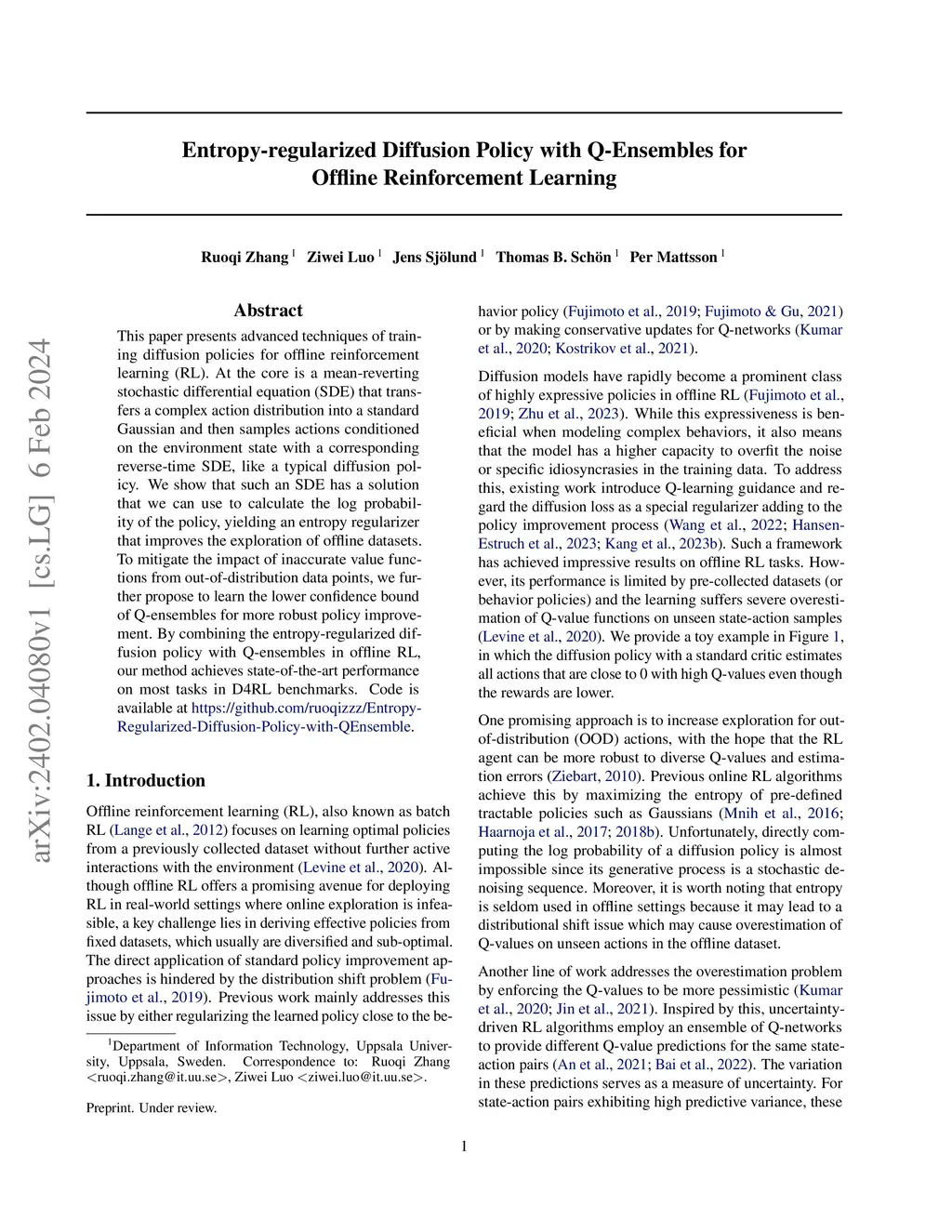This paper presents advanced techniques of training diffusion policies for offline reinforcement learning (RL). At the core is a mean-reverting stochastic differential equation (SDE) that transfers a complex action distribution into a standard Gaussian and then samples actions conditioned on the environment state with a corresponding reverse-time SDE, like a typical diffusion policy. We show that such an SDE has a solution that we can use to calculate the log probability of the policy, yielding an entropy regularizer that improves the exploration of offline datasets. To mitigate the impact of inaccurate value functions from out-of-distribution data points, we further propose to learn the lower confidence bound of Q-ensembles for more robust policy improvement. By combining the entropy-regularized diffusion policy with Q-ensembles in offline RL, our method achieves state-of-the-art performance on most tasks in D4RL benchmarks. Code is available atthis https URL.