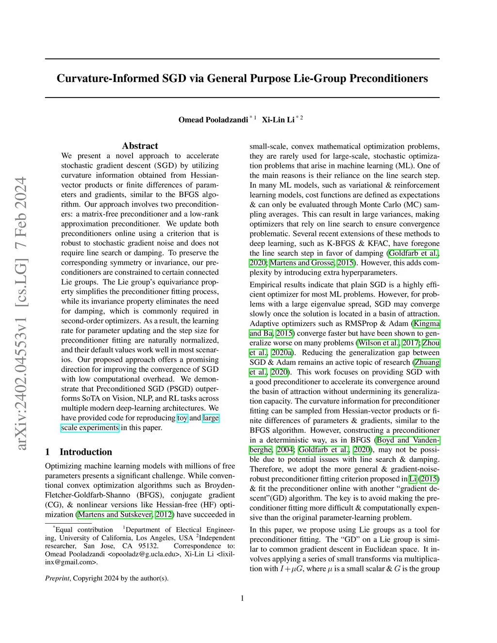 We present a novel approach to accelerate stochastic gradient descent (SGD) by utilizing curvature information obtained from Hessian-vector products or finite differences of parameters and gradients, similar to the BFGS algorithm. Our approach involves two preconditioners: a matrix-free preconditioner and a low-rank approximation preconditioner. We update both preconditioners online using a criterion that is robust to stochastic gradient noise and does not require line search or damping. To preserve the corresponding symmetry or invariance, our preconditioners are constrained to certain connected Lie groups. The Lie group's equivariance property simplifies the preconditioner fitting process, while its invariance property eliminates the need for damping, which is commonly required in second-order optimizers. As a result, the learning rate for parameter updating and the step size for preconditioner fitting are naturally normalized, and their default values work well in most scenarios. Our proposed approach offers a promising direction for improving the convergence of SGD with low computational overhead. We demonstrate that Preconditioned SGD (PSGD) outperforms SoTA on Vision, NLP, and RL tasks across multiple modern deep-learning architectures. We have provided code for reproducing toy and large scale experiments in this paper.