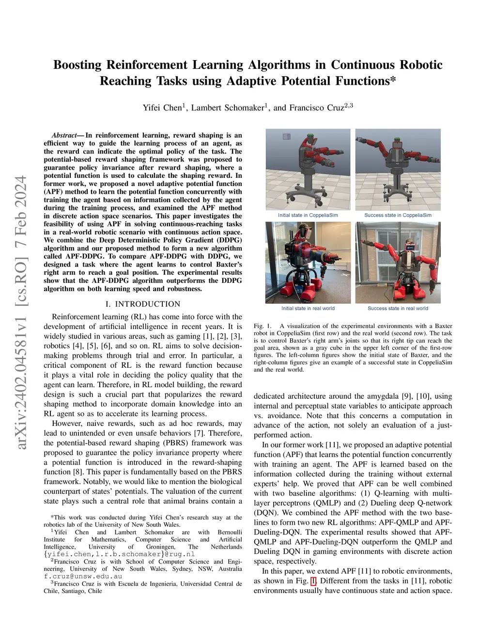 In reinforcement learning, reward shaping is an efficient way to guide the learning process of an agent, as the reward can indicate the optimal policy of the task. The potential-based reward shaping framework was proposed to guarantee policy invariance after reward shaping, where a potential function is used to calculate the shaping reward. In former work, we proposed a novel adaptive potential function (APF) method to learn the potential function concurrently with training the agent based on information collected by the agent during the training process, and examined the APF method in discrete action space scenarios. This paper investigates the feasibility of using APF in solving continuous-reaching tasks in a real-world robotic scenario with continuous action space. We combine the Deep Deterministic Policy Gradient (DDPG) algorithm and our proposed method to form a new algorithm called APF-DDPG. To compare APF-DDPG with DDPG, we designed a task where the agent learns to control Baxter's right arm to reach a goal position. The experimental results show that the APF-DDPG algorithm outperforms the DDPG algorithm on both learning speed and robustness.