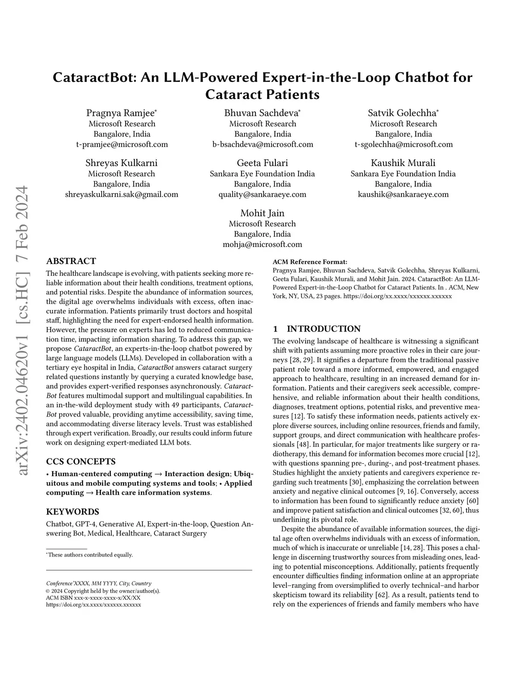 The healthcare landscape is evolving, with patients seeking reliable information about their health conditions and available treatment options. Despite the abundance of information sources, the digital age overwhelms individuals with excess, often inaccurate information. Patients primarily trust medical professionals, highlighting the need for expert-endorsed health information. However, increased patient loads on experts has led to reduced communication time, impacting information sharing. To address this gap, we developed CataractBot. CataractBot answers cataract surgery related questions instantly using an LLM to query a curated knowledge base, and provides expert-verified responses asynchronously. It has multimodal and multilingual capabilities. In an in-the-wild deployment study with 49 patients and attendants, 4 doctors, and 2 patient coordinators, CataractBot demonstrated potential, providing anytime accessibility, saving time, accommodating diverse literacy levels, alleviating power differences, and adding a privacy layer between patients and doctors. Users reported that their trust in the system was established through expert verification. Broadly, our results could inform future work on designing expert-mediated LLM bots.