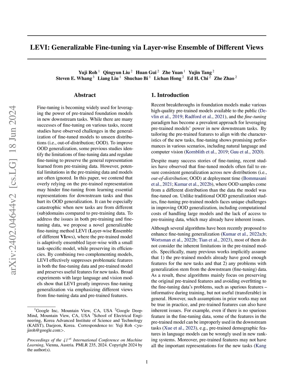 Fine-tuning is becoming widely used for leveraging the power of pre-trained foundation models in new downstream tasks. While there are many successes of fine-tuning on various tasks, recent studies have observed challenges in the generalization of fine-tuned models to unseen distributions (i.e., out-of-distribution; OOD). To improve OOD generalization, some previous studies identify the limitations of fine-tuning data and regulate fine-tuning to preserve the general representation learned from pre-training data. However, potential limitations in the pre-training data and models are often ignored. In this paper, we contend that overly relying on the pre-trained representation may hinder fine-tuning from learning essential representations for downstream tasks and thus hurt its OOD generalization. It can be especially catastrophic when new tasks are from different (sub)domains compared to pre-training data. To address the issues in both pre-training and fine-tuning data, we propose a novel generalizable fine-tuning method LEVI (Layer-wise Ensemble of different VIews), where the pre-trained model is adaptively ensembled layer-wise with a small task-specific model, while preserving its efficiencies. By combining two complementing models, LEVI effectively suppresses problematic features in both the fine-tuning data and pre-trained model and preserves useful features for new tasks. Broad experiments with large language and vision models show that LEVI greatly improves fine-tuning generalization via emphasizing different views from fine-tuning data and pre-trained features.
