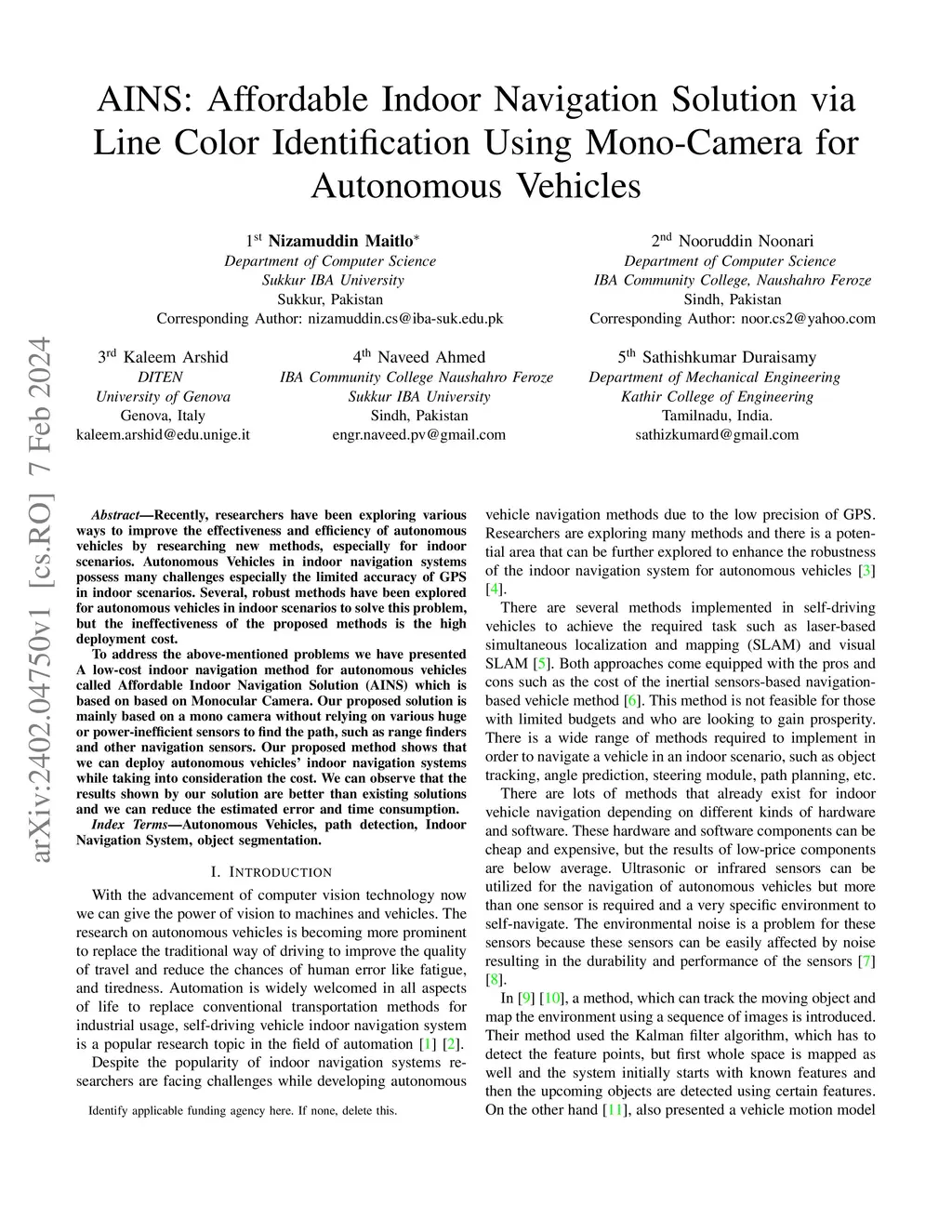 Recently, researchers have been exploring various ways to improve the effectiveness and efficiency of autonomous vehicles by researching new methods, especially for indoor scenarios. Autonomous Vehicles in indoor navigation systems possess many challenges especially the limited accuracy of GPS in indoor scenarios. Several, robust methods have been explored for autonomous vehicles in indoor scenarios to solve this problem, but the ineffectiveness of the proposed methods is the high deployment cost. To address the above-mentioned problems we have presented A low-cost indoor navigation method for autonomous vehicles called Affordable Indoor Navigation Solution (AINS) which is based on based on Monocular Camera. Our proposed solution is mainly based on a mono camera without relying on various huge or power-inefficient sensors to find the path, such as range finders and other navigation sensors. Our proposed method shows that we can deploy autonomous vehicles indoor navigation systems while taking into consideration the cost. We can observe that the results shown by our solution are better than existing solutions and we can reduce the estimated error and time consumption.