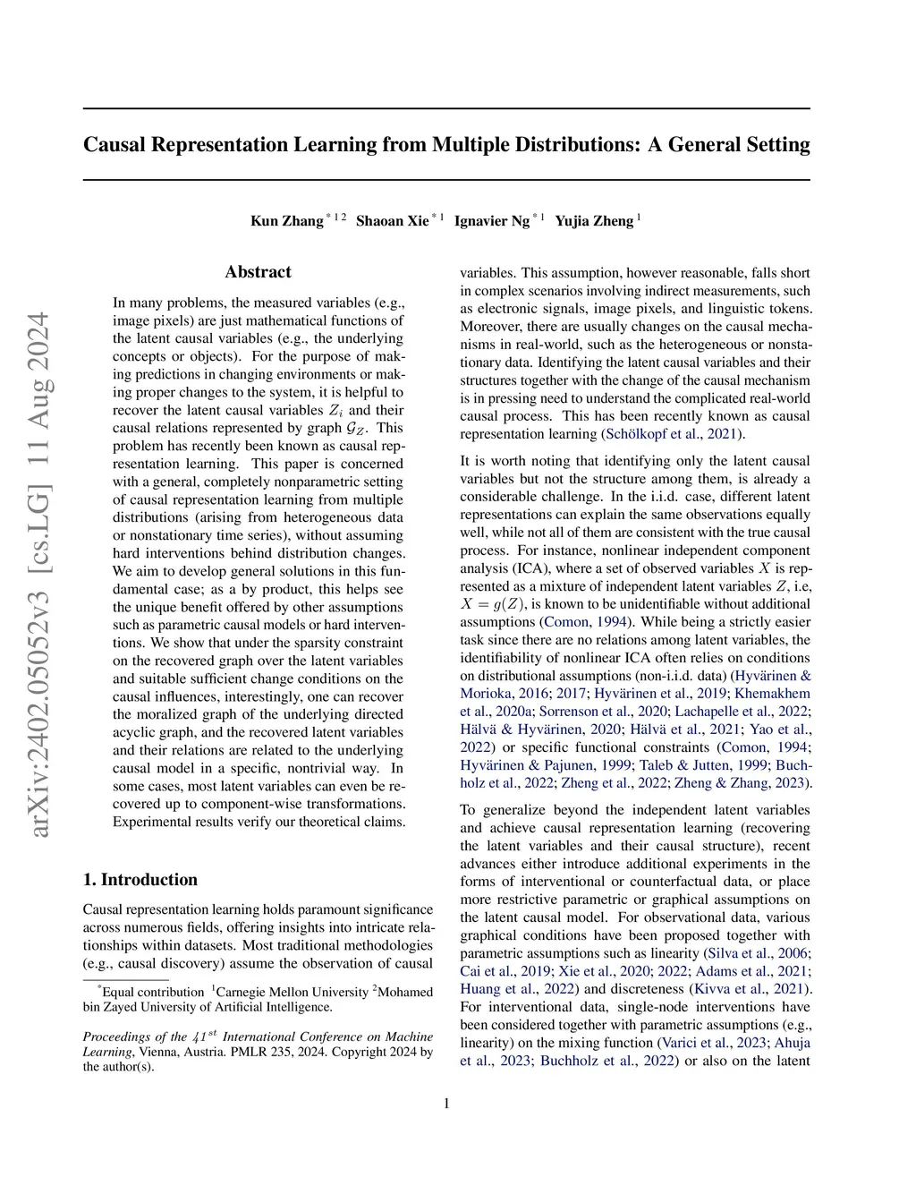 In many problems, the measured variables (e.g., image pixels) are just mathematical functions of the hidden causal variables (e.g., the underlying concepts or objects). For the purpose of making predictions in changing environments or making proper changes to the system, it is helpful to recover the hidden causal variables and their causal relations represented by graph . This problem has recently been known as causal representation learning. This paper is concerned with a general, completely nonparametric setting of causal representation learning from multiple distributions (arising from heterogeneous data or nonstationary time series), without assuming hard interventions behind distribution changes. We aim to develop general solutions in this fundamental case; as a by product, this helps see the unique benefit offered by other assumptions such as parametric causal models or hard interventions. We show that under the sparsity constraint on the recovered graph over the latent variables and suitable sufficient change conditions on the causal influences, interestingly, one can recover the moralized graph of the underlying directed acyclic graph, and the recovered latent variables and their relations are related to the underlying causal model in a specific, nontrivial way. In some cases, each latent variable can even be recovered up to component-wise transformations. Experimental results verify our theoretical claims.