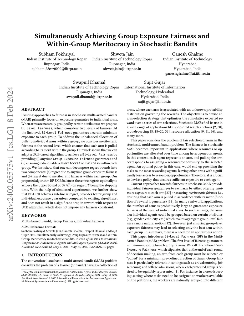 Existing approaches to fairness in stochastic multi-armed bandits (MAB) primarily focus on exposure guarantee to individual arms. When arms are naturally grouped by certain attribute(s), we propose Bi-Level Fairness, which considers two levels of fairness. At the first level, Bi-Level Fairness guarantees a certain minimum exposure to each group. To address the unbalanced allocation of pulls to individual arms within a group, we consider meritocratic fairness at the second level, which ensures that each arm is pulled according to its merit within the group. Our work shows that we can adapt a UCB-based algorithm to achieve a Bi-Level Fairness by providing (i) anytime Group Exposure Fairness guarantees and (ii) ensuring individual-level Meritocratic Fairness within each group. We first show that one can decompose regret bounds into two components: (a) regret due to anytime group exposure fairness and (b) regret due to meritocratic fairness within each group. Our proposed algorithm BF-UCB balances these two regrets optimally to achieve the upper bound of on regret; being the stopping time. With the help of simulated experiments, we further show that BF-UCB achieves sub-linear regret; provides better group and individual exposure guarantees compared to existing algorithms; and does not result in a significant drop in reward with respect to UCB algorithm, which does not impose any fairness constraint.