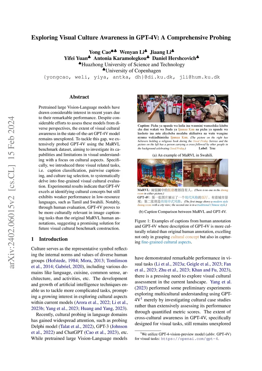 Pretrained large Vision-Language models have drawn considerable interest in recent years due to their remarkable performance. Despite considerable efforts to assess these models from diverse perspectives, the extent of visual cultural awareness in the state-of-the-art GPT-4V model remains unexplored. To tackle this gap, we extensively probed GPT-4V using the MaRVL benchmark dataset, aiming to investigate its capabilities and limitations in visual understanding with a focus on cultural aspects. Specifically, we introduced three visual related tasks, i.e. caption classification, pairwise captioning, and culture tag selection, to systematically delve into fine-grained visual cultural evaluation. Experimental results indicate that GPT-4V excels at identifying cultural concepts but still exhibits weaker performance in low-resource languages, such as Tamil and Swahili. Notably, through human evaluation, GPT-4V proves to be more culturally relevant in image captioning tasks than the original MaRVL human annotations, suggesting a promising solution for future visual cultural benchmark construction.