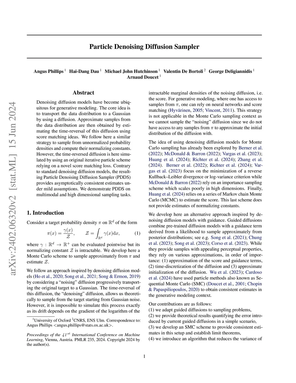 Denoising diffusion models have become ubiquitous for generative modeling. The core idea is to transport the data distribution to a Gaussian by using a diffusion. Approximate samples from the data distribution are then obtained by estimating the time-reversal of this diffusion using score matching ideas. We follow here a similar strategy to sample from unnormalized probability densities and compute their normalizing constants. However, the time-reversed diffusion is here simulated by using an original iterative particle scheme relying on a novel score matching loss. Contrary to standard denoising diffusion models, the resulting Particle Denoising Diffusion Sampler (PDDS) provides asymptotically consistent estimates under mild assumptions. We demonstrate PDDS on multimodal and high dimensional sampling tasks.