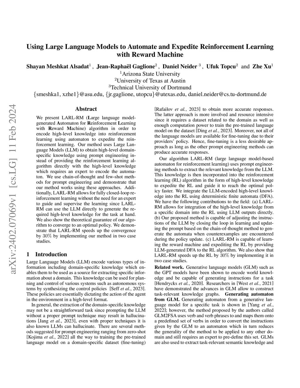 We present LARL-RM (Large language model-generated Automaton for Reinforcement Learning with Reward Machine) algorithm in order to encode high-level knowledge into reinforcement learning using automaton to expedite the reinforcement learning. Our method uses Large Language Models (LLM) to obtain high-level domain-specific knowledge using prompt engineering instead of providing the reinforcement learning algorithm directly with the high-level knowledge which requires an expert to encode the automaton. We use chain-of-thought and few-shot methods for prompt engineering and demonstrate that our method works using these approaches. Additionally, LARL-RM allows for fully closed-loop reinforcement learning without the need for an expert to guide and supervise the learning since LARL-RM can use the LLM directly to generate the required high-level knowledge for the task at hand. We also show the theoretical guarantee of our algorithm to converge to an optimal policy. We demonstrate that LARL-RM speeds up the convergence by 30% by implementing our method in two case studies.