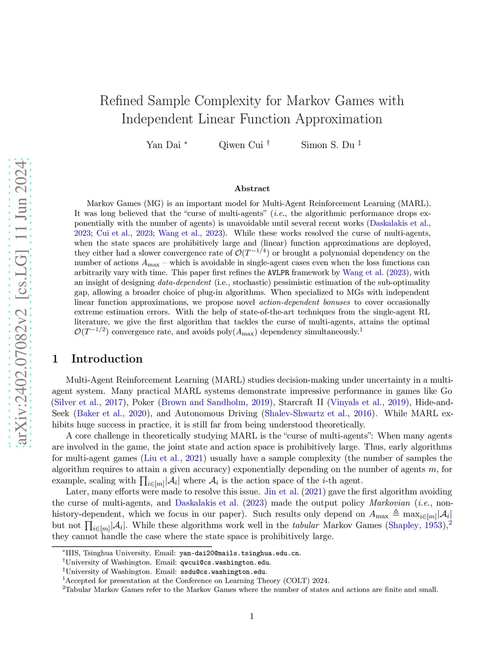 Markov Games (MG) is an important model for Multi-Agent Reinforcement Learning (MARL). It was long believed that the "curse of multi-agents" (i.e., the algorithmic performance drops exponentially with the number of agents) is unavoidable until several recent works (Daskalakis et al., 2023; Cui et al., 2023; Wang et al., 2023). While these works resolved the curse of multi-agents, when the state spaces are prohibitively large and (linear) function approximations are deployed, they either had a slower convergence rate of or brought a polynomial dependency on the number of actions -- which is avoidable in single-agent cases even when the loss functions can arbitrarily vary with time. This paper first refines the AVLPR framework by Wang et al. (2023), with an insight of designing *data-dependent* (i.e., stochastic) pessimistic estimation of the sub-optimality gap, allowing a broader choice of plug-in algorithms. When specialized to MGs with independent linear function approximations, we propose novel *action-dependent bonuses* to cover occasionally extreme estimation errors. With the help of state-of-the-art techniques from the single-agent RL literature, we give the first algorithm that tackles the curse of multi-agents, attains the optimal convergence rate, and avoids dependency simultaneously.