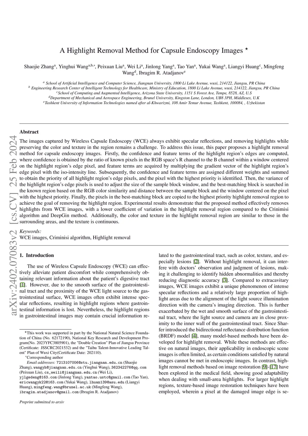 The images captured by Wireless Capsule Endoscopy (WCE) always exhibit specular reflections, and removing highlights while preserving the color and texture in the region remains a challenge. To address this issue, this paper proposes a highlight removal method for capsule endoscopy images. Firstly, the confidence and feature terms of the highlight region's edges are computed, where confidence is obtained by the ratio of known pixels in the RGB space's R channel to the B channel within a window centered on the highlight region's edge pixel, and feature terms are acquired by multiplying the gradient vector of the highlight region's edge pixel with the iso-intensity line. Subsequently, the confidence and feature terms are assigned different weights and summed to obtain the priority of all highlight region's edge pixels, and the pixel with the highest priority is identified. Then, the variance of the highlight region's edge pixels is used to adjust the size of the sample block window, and the best-matching block is searched in the known region based on the RGB color similarity and distance between the sample block and the window centered on the pixel with the highest priority. Finally, the pixels in the best-matching block are copied to the highest priority highlight removal region to achieve the goal of removing the highlight region. Experimental results demonstrate that the proposed method effectively removes highlights from WCE images, with a lower coefficient of variation in the highlight removal region compared to the Crinimisi algorithm and DeepGin method. Additionally, the color and texture in the highlight removal region are similar to those in the surrounding areas, and the texture is continuous.