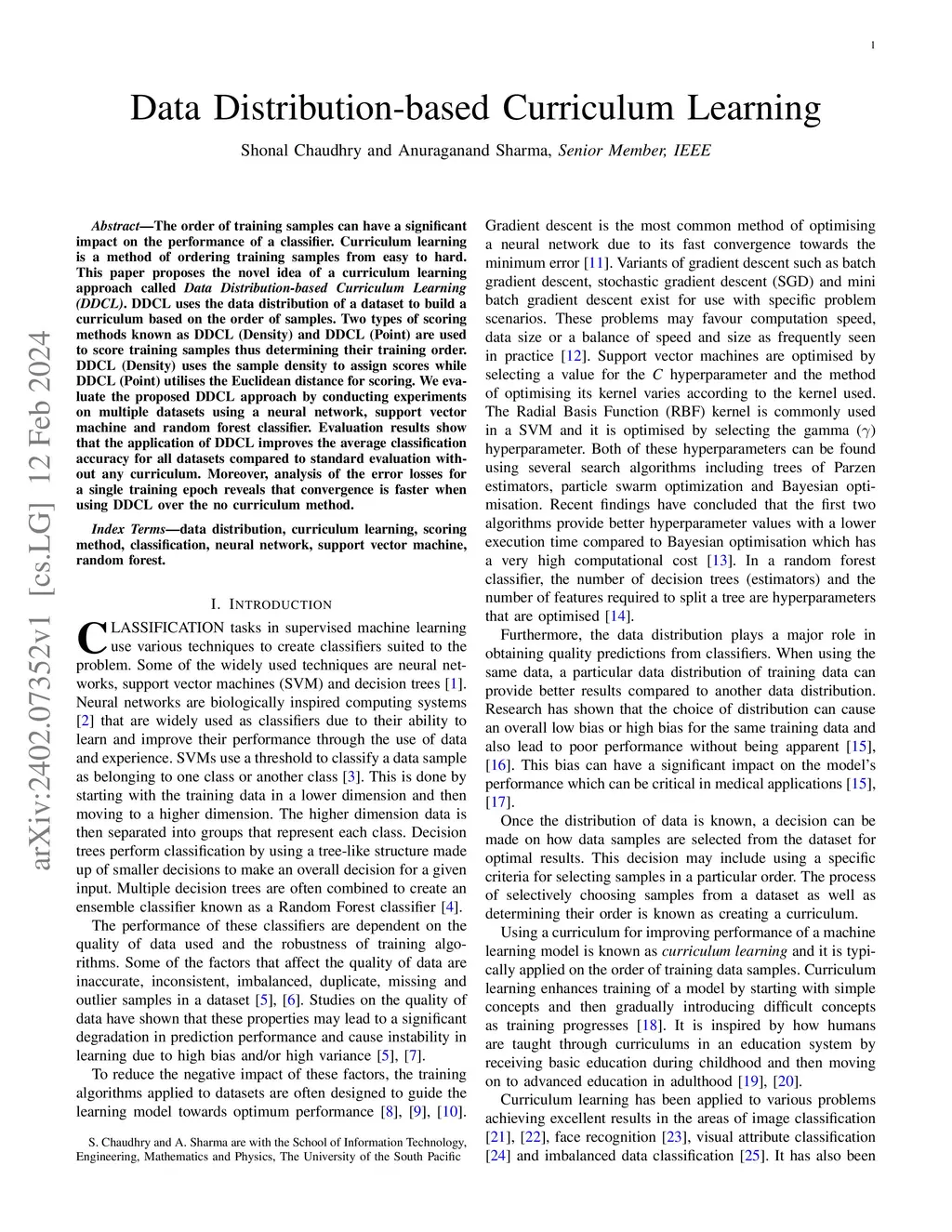 The order of training samples can have a significant impact on the performance of a classifier. Curriculum learning is a method of ordering training samples from easy to hard. This paper proposes the novel idea of a curriculum learning approach called Data Distribution-based Curriculum Learning (DDCL). DDCL uses the data distribution of a dataset to build a curriculum based on the order of samples. Two types of scoring methods known as DDCL (Density) and DDCL (Point) are used to score training samples thus determining their training order. DDCL (Density) uses the sample density to assign scores while DDCL (Point) utilises the Euclidean distance for scoring. We evaluate the proposed DDCL approach by conducting experiments on multiple datasets using a neural network, support vector machine and random forest classifier. Evaluation results show that the application of DDCL improves the average classification accuracy for all datasets compared to standard evaluation without any curriculum. Moreover, analysis of the error losses for a single training epoch reveals that convergence is faster when using DDCL over the no curriculum method.