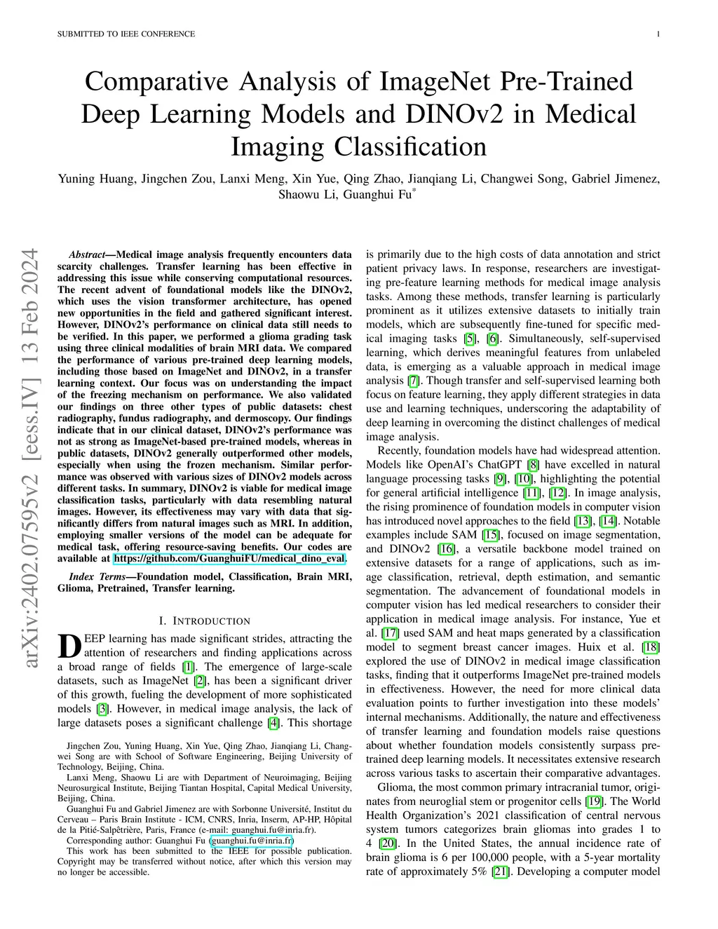 Medical image analysis frequently encounters data scarcity challenges. Transfer learning has been effective in addressing this issue while conserving computational resources. The recent advent of foundational models like the DINOv2, which uses the vision transformer architecture, has opened new opportunities in the field and gathered significant interest. However, DINOv2's performance on clinical data still needs to be verified. In this paper, we performed a glioma grading task using three clinical modalities of brain MRI data. We compared the performance of various pre-trained deep learning models, including those based on ImageNet and DINOv2, in a transfer learning context. Our focus was on understanding the impact of the freezing mechanism on performance. We also validated our findings on three other types of public datasets: chest radiography, fundus radiography, and dermoscopy. Our findings indicate that in our clinical dataset, DINOv2's performance was not as strong as ImageNet-based pre-trained models, whereas in public datasets, DINOv2 generally outperformed other models, especially when using the frozen mechanism. Similar performance was observed with various sizes of DINOv2 models across different tasks. In summary, DINOv2 is viable for medical image classification tasks, particularly with data resembling natural images. However, its effectiveness may vary with data that significantly differs from natural images such as MRI. In addition, employing smaller versions of the model can be adequate for medical task, offering resource-saving benefits. Our codes are available at https://github.com/GuanghuiFU/medical_DINOv2_eval.