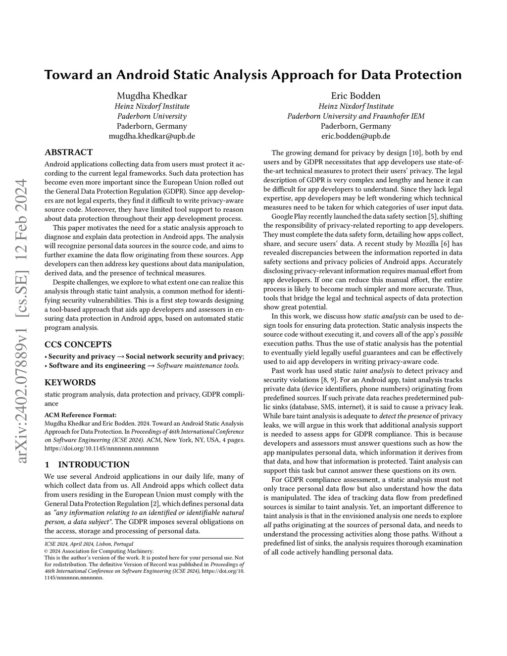 Android applications collecting data from users must protect it according to the current legal frameworks. Such data protection has become even more important since the European Union rolled out the General Data Protection Regulation (GDPR). Since app developers are not legal experts, they find it difficult to write privacy-aware source code. Moreover, they have limited tool support to reason about data protection throughout their app development process. This paper motivates the need for a static analysis approach to diagnose and explain data protection in Android apps. The analysis will recognize personal data sources in the source code, and aims to further examine the data flow originating from these sources. App developers can then address key questions about data manipulation, derived data, and the presence of technical measures. Despite challenges, we explore to what extent one can realize this analysis through static taint analysis, a common method for identifying security vulnerabilities. This is a first step towards designing a tool-based approach that aids app developers and assessors in ensuring data protection in Android apps, based on automated static program analysis.