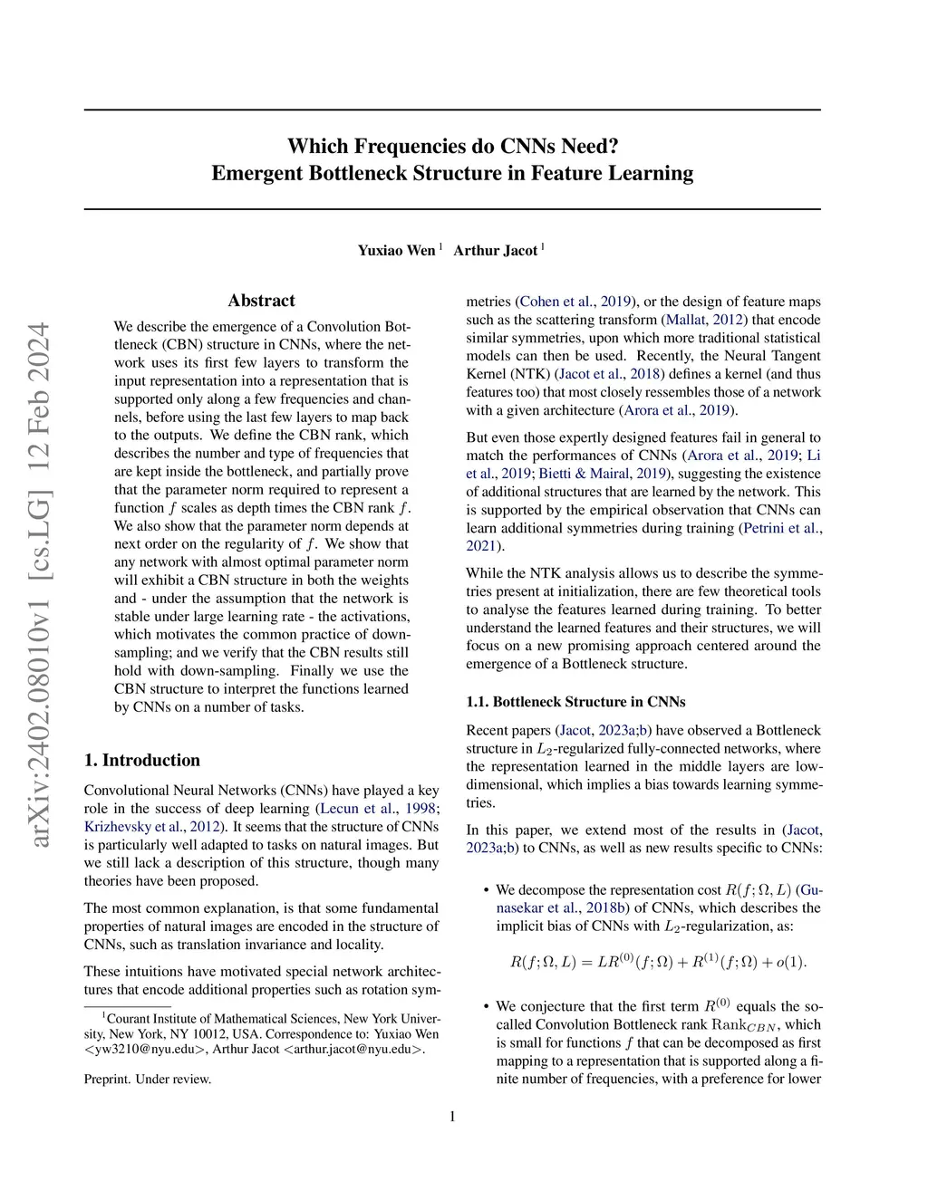 We describe the emergence of a Convolution Bottleneck (CBN) structure in CNNs, where the network uses its first few layers to transform the input representation into a representation that is supported only along a few frequencies and channels, before using the last few layers to map back to the outputs. We define the CBN rank, which describes the number and type of frequencies that are kept inside the bottleneck, and partially prove that the parameter norm required to represent a function scales as depth times the CBN rank . We also show that the parameter norm depends at next order on the regularity of . We show that any network with almost optimal parameter norm will exhibit a CBN structure in both the weights and - under the assumption that the network is stable under large learning rate - the activations, which motivates the common practice of down-sampling; and we verify that the CBN results still hold with down-sampling. Finally we use the CBN structure to interpret the functions learned by CNNs on a number of tasks.
