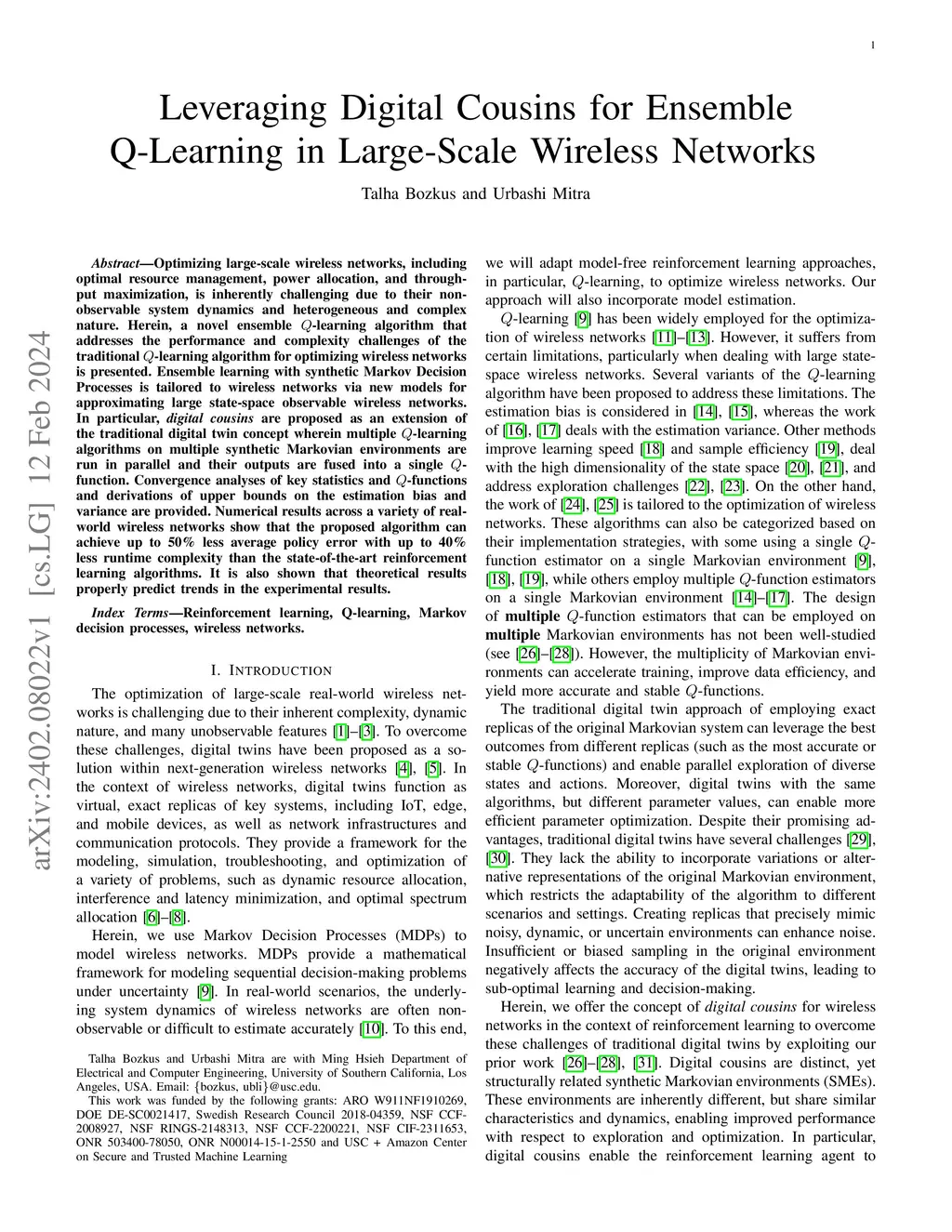 Optimizing large-scale wireless networks, including optimal resource management, power allocation, and throughput maximization, is inherently challenging due to their non-observable system dynamics and heterogeneous and complex nature. Herein, a novel ensemble Q-learning algorithm that addresses the performance and complexity challenges of the traditional Q-learning algorithm for optimizing wireless networks is presented. Ensemble learning with synthetic Markov Decision Processes is tailored to wireless networks via new models for approximating large state-space observable wireless networks. In particular, digital cousins are proposed as an extension of the traditional digital twin concept wherein multiple Q-learning algorithms on multiple synthetic Markovian environments are run in parallel and their outputs are fused into a single Q-function. Convergence analyses of key statistics and Q-functions and derivations of upper bounds on the estimation bias and variance are provided. Numerical results across a variety of real-world wireless networks show that the proposed algorithm can achieve up to 50% less average policy error with up to 40% less runtime complexity than the state-of-the-art reinforcement learning algorithms. It is also shown that theoretical results properly predict trends in the experimental results.