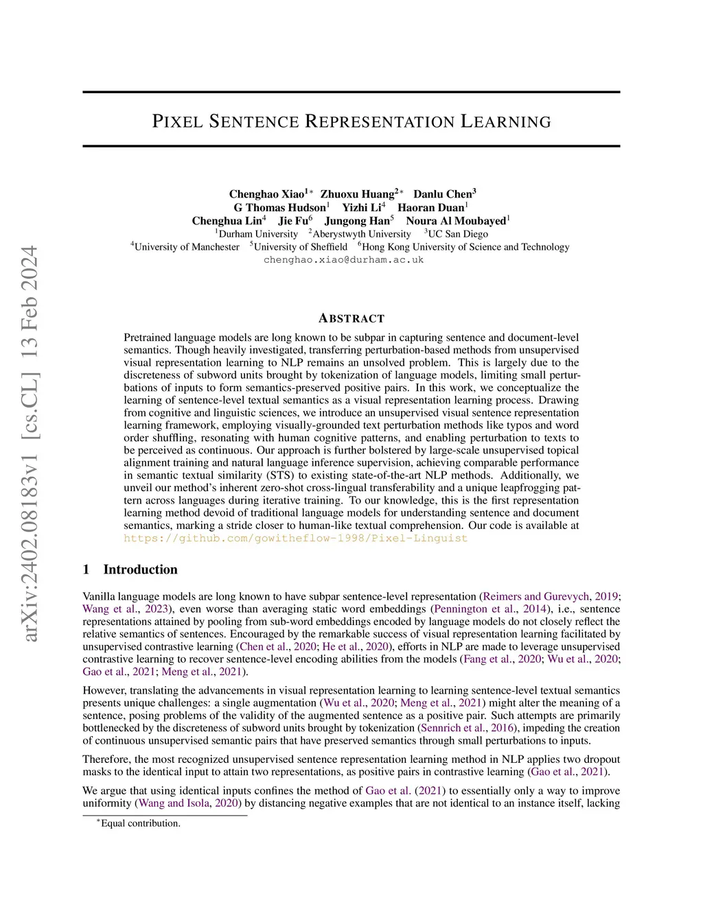 Pretrained language models are long known to be subpar in capturing sentence and document-level semantics. Though heavily investigated, transferring perturbation-based methods from unsupervised visual representation learning to NLP remains an unsolved problem. This is largely due to the discreteness of subword units brought by tokenization of language models, limiting small perturbations of inputs to form semantics-preserved positive pairs. In this work, we conceptualize the learning of sentence-level textual semantics as a visual representation learning process. Drawing from cognitive and linguistic sciences, we introduce an unsupervised visual sentence representation learning framework, employing visually-grounded text perturbation methods like typos and word order shuffling, resonating with human cognitive patterns, and enabling perturbation to texts to be perceived as continuous. Our approach is further bolstered by large-scale unsupervised topical alignment training and natural language inference supervision, achieving comparable performance in semantic textual similarity (STS) to existing state-of-the-art NLP methods. Additionally, we unveil our method's inherent zero-shot cross-lingual transferability and a unique leapfrogging pattern across languages during iterative training. To our knowledge, this is the first representation learning method devoid of traditional language models for understanding sentence and document semantics, marking a stride closer to human-like textual comprehension. Our code is available at https://github.com/gowitheflow-1998/Pixel-Linguist