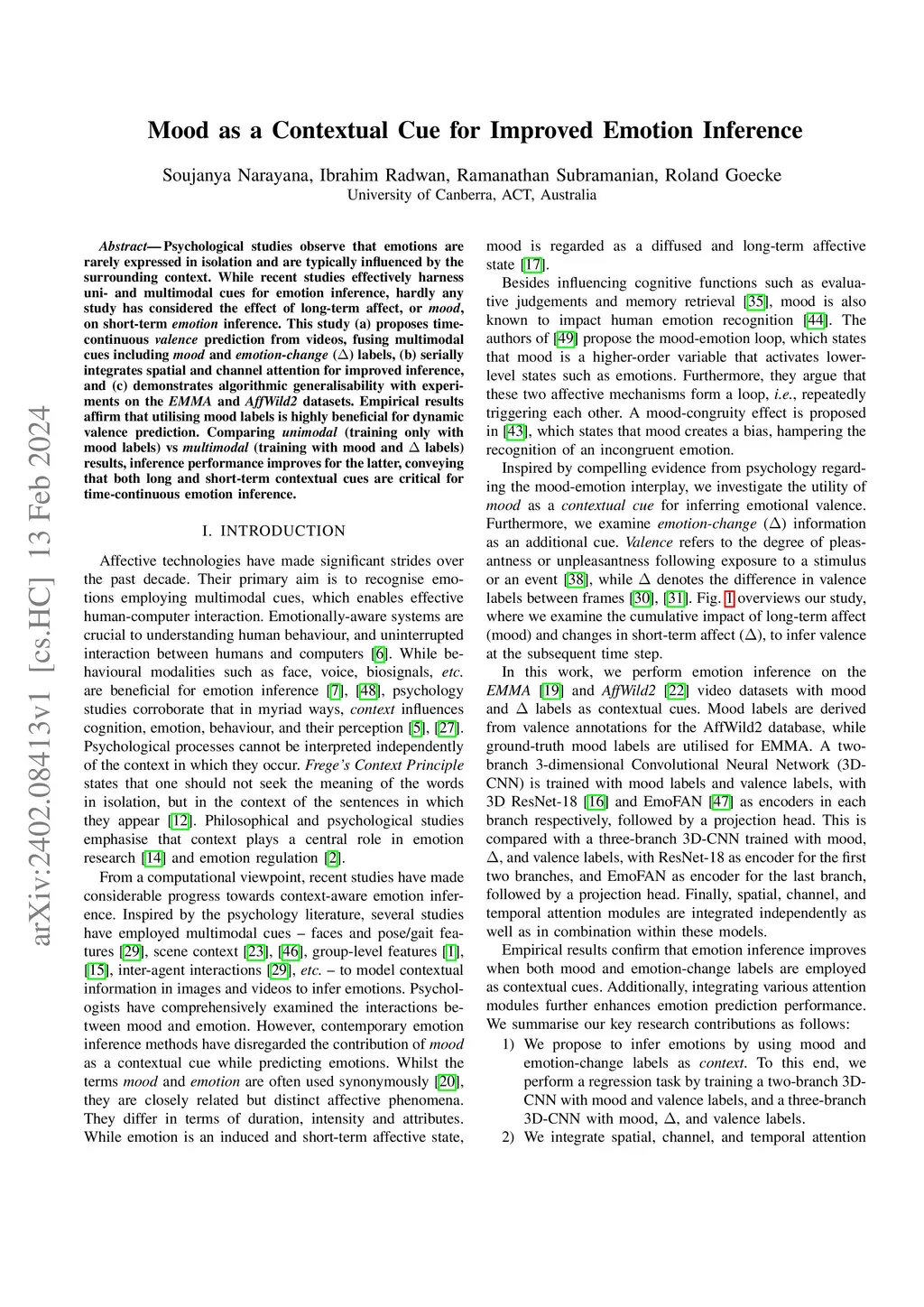 Psychological studies observe that emotions are rarely expressed in isolation and are typically influenced by the surrounding context. While recent studies effectively harness uni- and multimodal cues for emotion inference, hardly any study has considered the effect of long-term affect, or \emph{mood}, on short-term \emph{emotion} inference. This study (a) proposes time-continuous \emph{valence} prediction from videos, fusing multimodal cues including \emph{mood} and \emph{emotion-change} () labels, (b) serially integrates spatial and channel attention for improved inference, and (c) demonstrates algorithmic generalisability with experiments on the \emph{EMMA} and \emph{AffWild2} datasets. Empirical results affirm that utilising mood labels is highly beneficial for dynamic valence prediction. Comparing \emph{unimodal} (training only with mood labels) vs \emph{multimodal} (training with mood and labels) results, inference performance improves for the latter, conveying that both long and short-term contextual cues are critical for time-continuous emotion inference.
