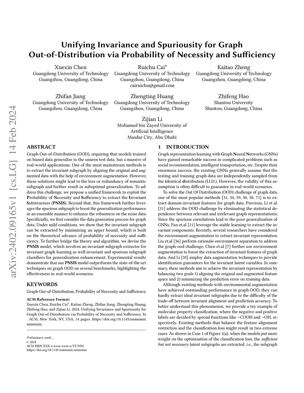 Graph Out-of-Distribution (OOD), requiring that models trained on biased data generalize to the unseen test data, has a massive of real-world applications. One of the most mainstream methods is to extract the invariant subgraph by aligning the original and augmented data with the help of environment augmentation. However, these solutions might lead to the loss or redundancy of semantic subgraph and further result in suboptimal generalization. To address this challenge, we propose a unified framework to exploit the Probability of Necessity and Sufficiency to extract the Invariant Substructure (PNSIS). Beyond that, this framework further leverages the spurious subgraph to boost the generalization performance in an ensemble manner to enhance the robustness on the noise data. Specificially, we first consider the data generation process for graph data. Under mild conditions, we show that the invariant subgraph can be extracted by minimizing an upper bound, which is built on the theoretical advance of probability of necessity and sufficiency. To further bridge the theory and algorithm, we devise the PNSIS model, which involves an invariant subgraph extractor for invariant graph learning as well invariant and spurious subgraph classifiers for generalization enhancement. Experimental results demonstrate that our \textbf{PNSIS} model outperforms the state-of-the-art techniques on graph OOD on several benchmarks, highlighting the effectiveness in real-world scenarios.