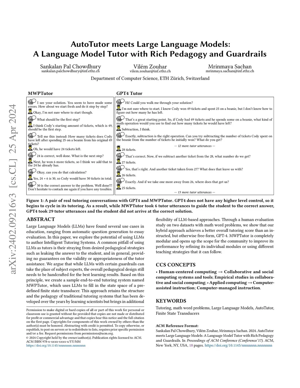 Large Language Models (LLMs) have found several use cases in education, ranging from automatic question generation to essay evaluation. In this paper, we explore the potential of using Large Language Models (LLMs) to author Intelligent Tutoring Systems. A common pitfall of LLMs is their straying from desired pedagogical strategies such as leaking the answer to the student, and in general, providing no guarantees. We posit that while LLMs with certain guardrails can take the place of subject experts, the overall pedagogical design still needs to be handcrafted for the best learning results. Based on this principle, we create a sample end-to-end tutoring system named MWPTutor, which uses LLMs to fill in the state space of a pre-defined finite state transducer. This approach retains the structure and the pedagogy of traditional tutoring systems that has been developed over the years by learning scientists but brings in additional flexibility of LLM-based approaches. Through a human evaluation study on two datasets based on math word problems, we show that our hybrid approach achieves a better overall tutoring score than an instructed, but otherwise free-form, GPT-4. MWPTutor is completely modular and opens up the scope for the community to improve its performance by improving individual modules or using different teaching strategies that it can follow.