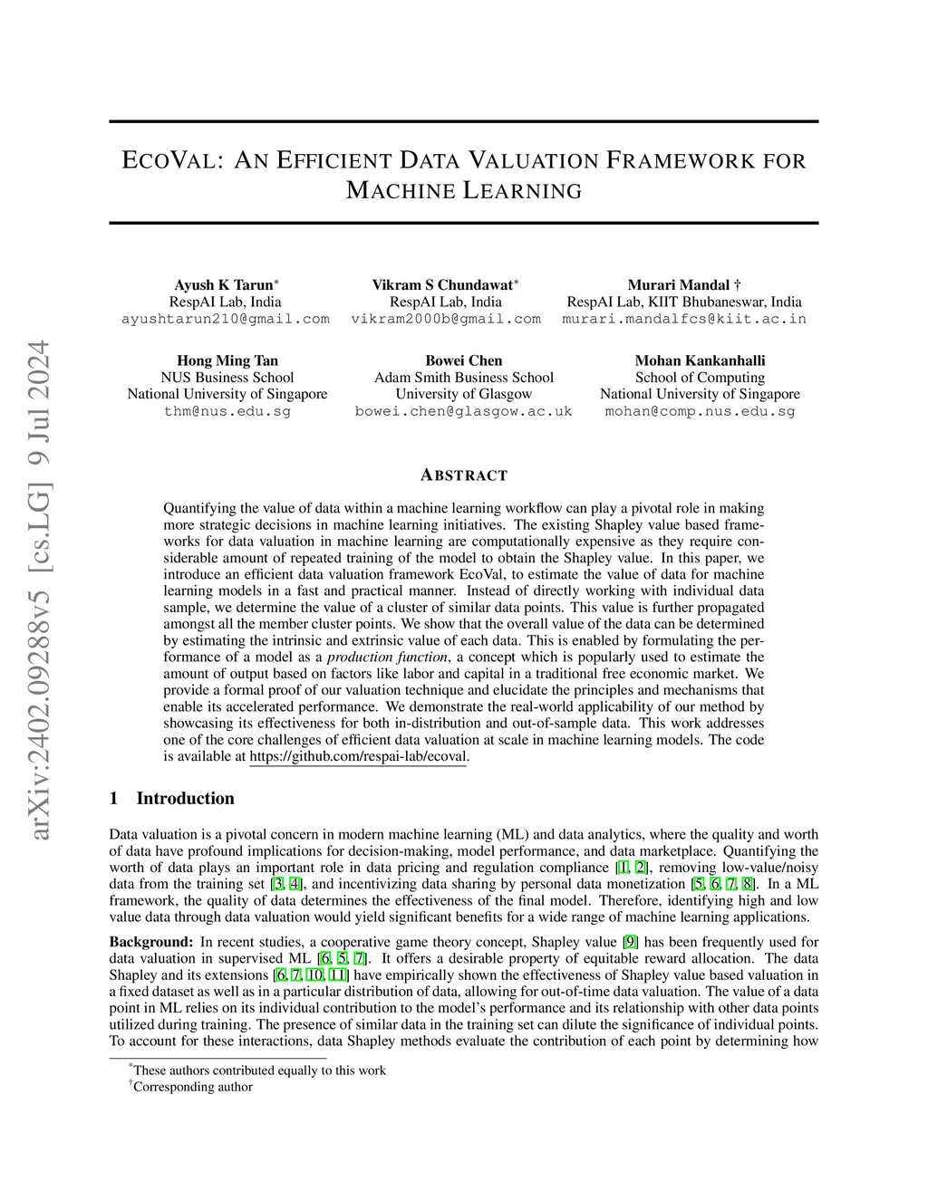 EcoVal: An Efficient Data Valuation Framework for Machine Learning
