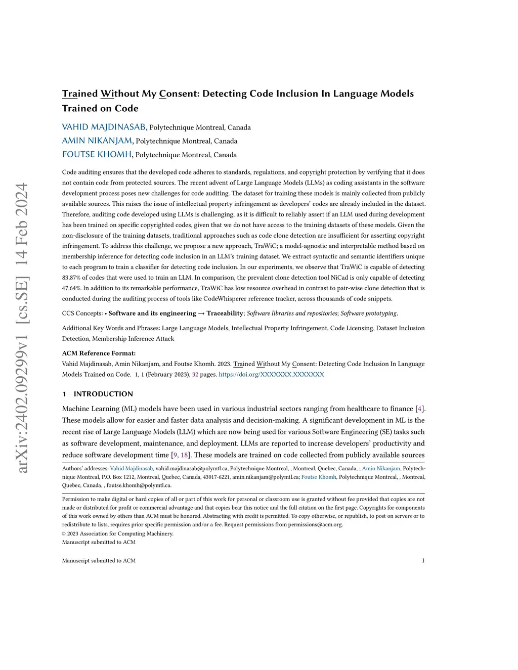 Code auditing ensures that the developed code adheres to standards, regulations, and copyright protection by verifying that it does not contain code from protected sources. The recent advent of Large Language Models (LLMs) as coding assistants in the software development process poses new challenges for code auditing. The dataset for training these models is mainly collected from publicly available sources. This raises the issue of intellectual property infringement as developers' codes are already included in the dataset. Therefore, auditing code developed using LLMs is challenging, as it is difficult to reliably assert if an LLM used during development has been trained on specific copyrighted codes, given that we do not have access to the training datasets of these models. Given the non-disclosure of the training datasets, traditional approaches such as code clone detection are insufficient for asserting copyright infringement. To address this challenge, we propose a new approach, TraWiC; a model-agnostic and interpretable method based on membership inference for detecting code inclusion in an LLM's training dataset. We extract syntactic and semantic identifiers unique to each program to train a classifier for detecting code inclusion. In our experiments, we observe that TraWiC is capable of detecting 83.87% of codes that were used to train an LLM. In comparison, the prevalent clone detection tool NiCad is only capable of detecting 47.64%. In addition to its remarkable performance, TraWiC has low resource overhead in contrast to pair-wise clone detection that is conducted during the auditing process of tools like CodeWhisperer reference tracker, across thousands of code snippets.