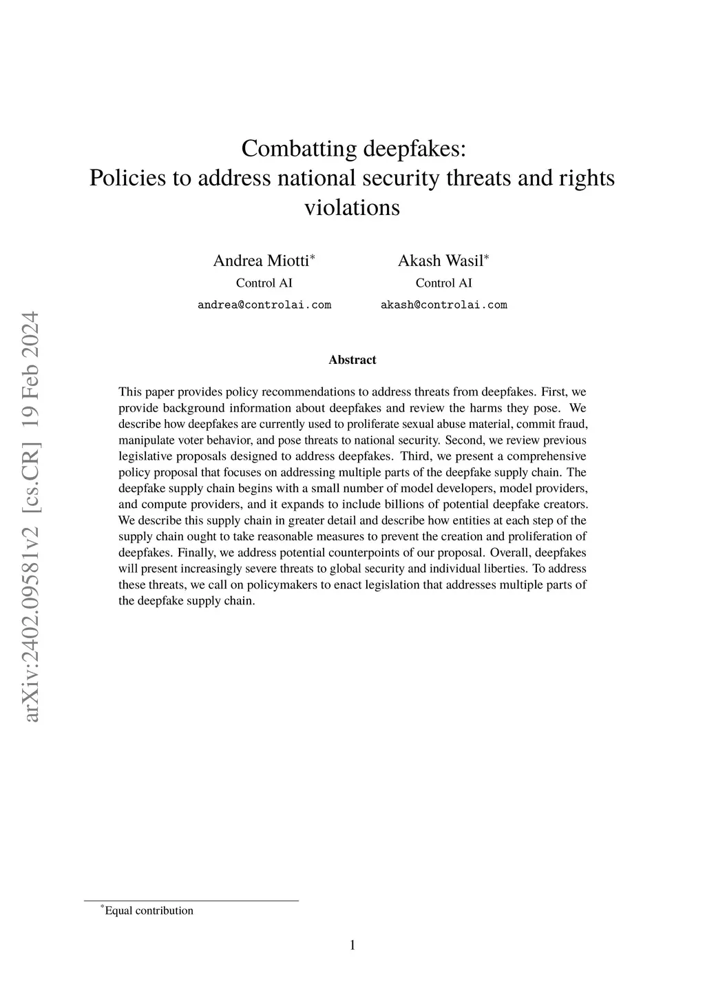 This paper provides policy recommendations to address threats from deepfakes. First, we provide background information about deepfakes and review the harms they pose. We describe how deepfakes are currently used to proliferate sexual abuse material, commit fraud, manipulate voter behavior, and pose threats to national security. Second, we review previous legislative proposals designed to address deepfakes. Third, we present a comprehensive policy proposal that focuses on addressing multiple parts of the deepfake supply chain. The deepfake supply chain begins with a small number of model developers, model providers, and compute providers, and it expands to include billions of potential deepfake creators. We describe this supply chain in greater detail and describe how entities at each step of the supply chain ought to take reasonable measures to prevent the creation and proliferation of deepfakes. Finally, we address potential counterpoints of our proposal. Overall, deepfakes will present increasingly severe threats to global security and individual liberties. To address these threats, we call on policymakers to enact legislation that addresses multiple parts of the deepfake supply chain.
