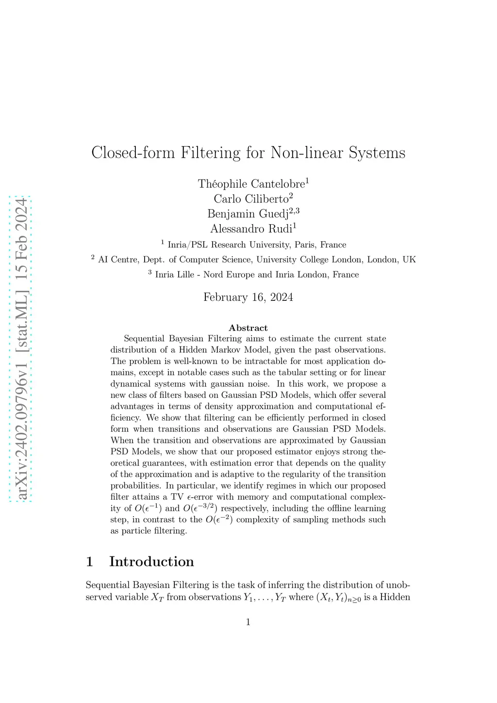 Sequential Bayesian Filtering aims to estimate the current state distribution of a Hidden Markov Model, given the past observations. The problem is well-known to be intractable for most application domains, except in notable cases such as the tabular setting or for linear dynamical systems with gaussian noise. In this work, we propose a new class of filters based on Gaussian PSD Models, which offer several advantages in terms of density approximation and computational efficiency. We show that filtering can be efficiently performed in closed form when transitions and observations are Gaussian PSD Models. When the transition and observations are approximated by Gaussian PSD Models, we show that our proposed estimator enjoys strong theoretical guarantees, with estimation error that depends on the quality of the approximation and is adaptive to the regularity of the transition probabilities. In particular, we identify regimes in which our proposed filter attains a TV -error with memory and computational complexity of and respectively, including the offline learning step, in contrast to the complexity of sampling methods such as particle filtering.