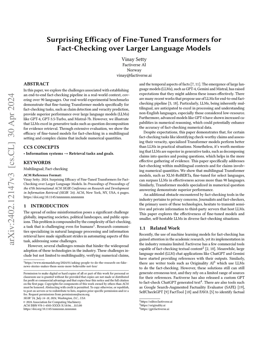 In this paper, we explore the challenges associated with establishing an end-to-end fact-checking pipeline in a real-world context, covering over 90 languages. Our real-world experimental benchmarks demonstrate that fine-tuning Transformer models specifically for fact-checking tasks, such as claim detection and veracity prediction, provide superior performance over large language models (LLMs) like GPT-4, GPT-3.5-Turbo, and Mistral-7b. However, we illustrate that LLMs excel in generative tasks such as question decomposition for evidence retrieval. Through extensive evaluation, we show the efficacy of fine-tuned models for fact-checking in a multilingual setting and complex claims that include numerical quantities.