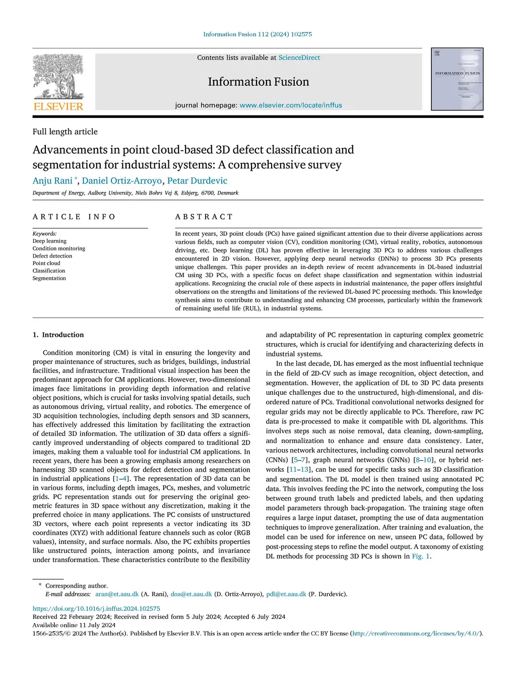 In recent years, 3D point clouds (PCs) have gained significant attention due to their diverse applications across various fields such as computer vision (CV), condition monitoring, virtual reality, robotics, autonomous driving etc. Deep learning (DL) has proven effective in leveraging 3D PCs to address various challenges previously encountered in 2D vision. However, the application of deep neural networks (DNN) to process 3D PCs presents its own set of challenges. To address these challenges, numerous methods have been proposed. This paper provides an in-depth review of recent advancements in DL-based condition monitoring (CM) using 3D PCs, with a specific focus on defect shape classification and segmentation within industrial applications for operational and maintenance purposes. Recognizing the crucial role of these aspects in industrial maintenance, the paper provides insightful observations that offer perspectives on the strengths and limitations of the reviewed DL-based PC processing methods. This synthesis of knowledge aims to contribute to the understanding and enhancement of CM processes, particularly within the framework of remaining useful life (RUL), in industrial systems.