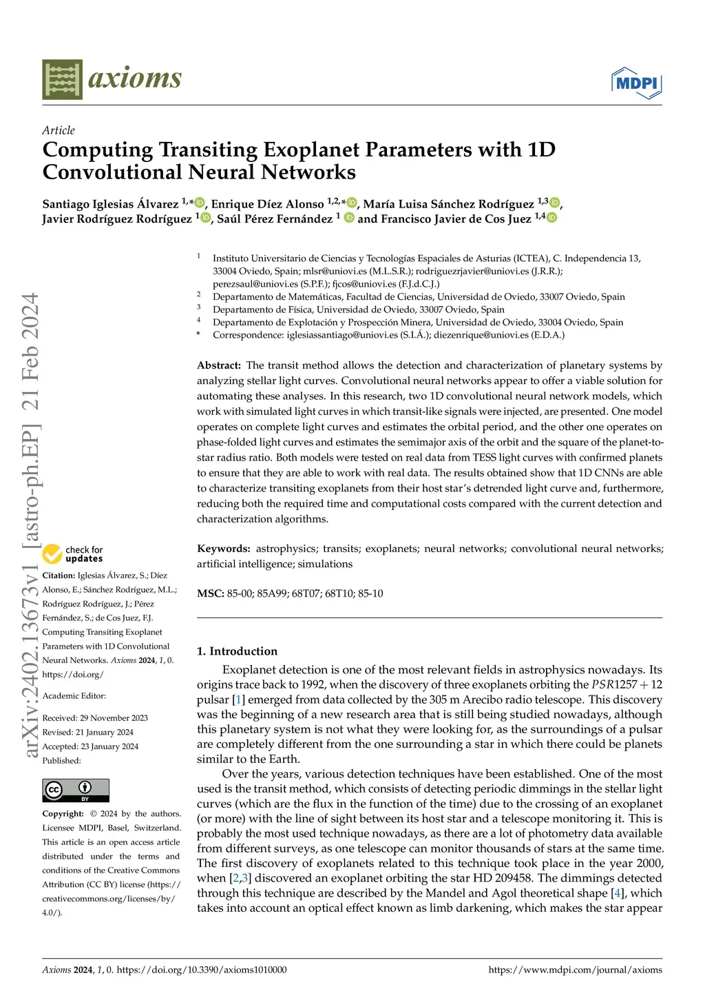 The transit method allows the detection and characterization of planetary systems by analyzing stellar light curves. Convolutional neural networks appear to offer a viable solution for automating these analyses. In this research, two 1D convolutional neural network models, which work with simulated light curves in which transit-like signals were injected, are presented. One model operates on complete light curves and estimates the orbital period, and the other one operates on phase-folded light curves and estimates the semimajor axis of the orbit and the square of the planet-to-star radius ratio. Both models were tested on real data from TESS light curves with confirmed planets to ensure that they are able to work with real data. The results obtained show that 1D CNNs are able to characterize transiting exoplanets from their host star's detrended light curve and, furthermore, reducing both the required time and computational costs compared with the current detection and characterization algorithms.