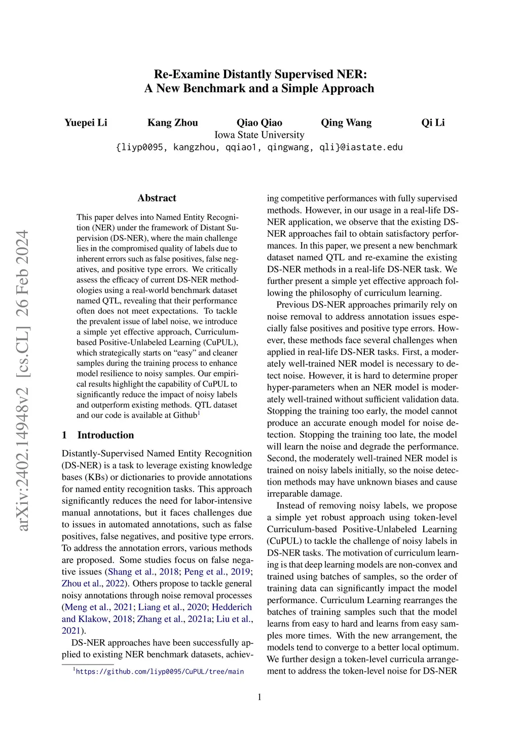 This paper delves into Named Entity Recognition (NER) under the framework of Distant Supervision (DS-NER), where the main challenge lies in the compromised quality of labels due to inherent errors such as false positives, false negatives, and positive type errors. We critically assess the efficacy of current DS-NER methodologies using a real-world benchmark dataset named QTL, revealing that their performance often does not meet expectations. To tackle the prevalent issue of label noise, we introduce a simple yet effective approach, Curriculum-based Positive-Unlabeled Learning CuPUL, which strategically starts on "easy" and cleaner samples during the training process to enhance model resilience to noisy samples. Our empirical results highlight the capability of CuPUL to significantly reduce the impact of noisy labels and outperform existing methods. QTL dataset and our code is available on GitHub.
