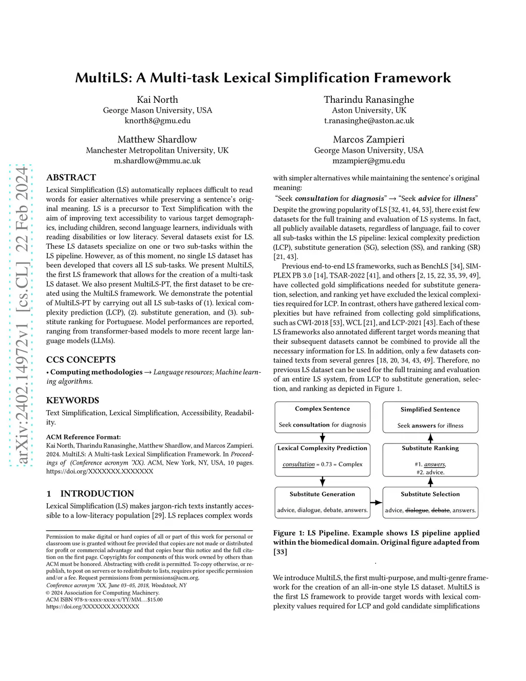 Lexical Simplification (LS) automatically replaces difficult to read words for easier alternatives while preserving a sentence's original meaning. LS is a precursor to Text Simplification with the aim of improving text accessibility to various target demographics, including children, second language learners, individuals with reading disabilities or low literacy. Several datasets exist for LS. These LS datasets specialize on one or two sub-tasks within the LS pipeline. However, as of this moment, no single LS dataset has been developed that covers all LS sub-tasks. We present MultiLS, the first LS framework that allows for the creation of a multi-task LS dataset. We also present MultiLS-PT, the first dataset to be created using the MultiLS framework. We demonstrate the potential of MultiLS-PT by carrying out all LS sub-tasks of (1). lexical complexity prediction (LCP), (2). substitute generation, and (3). substitute ranking for Portuguese. Model performances are reported, ranging from transformer-based models to more recent large language models (LLMs).