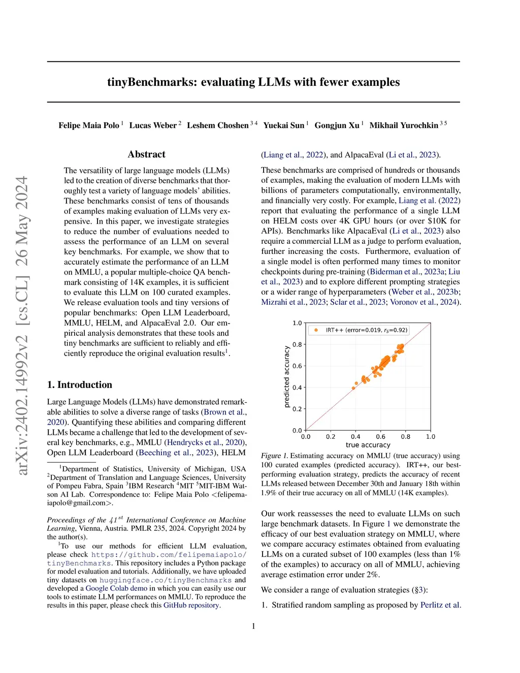 tinyBenchmarks: evaluating LLMs with fewer examples