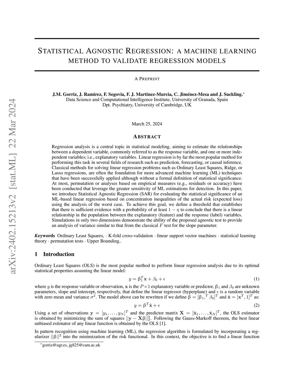 Regression analysis is a central topic in statistical modeling, aiming to estimate the relationships between a dependent variable, commonly referred to as the response variable, and one or more independent variables, i.e., explanatory variables. Linear regression is by far the most popular method for performing this task in several fields of research, such as prediction, forecasting, or causal inference. Beyond various classical methods to solve linear regression problems, such as Ordinary Least Squares, Ridge, or Lasso regressions - which are often the foundation for more advanced machine learning (ML) techniques - the latter have been successfully applied in this scenario without a formal definition of statistical significance. At most, permutation or classical analyses based on empirical measures (e.g., residuals or accuracy) have been conducted to reflect the greater ability of ML estimations for detection. In this paper, we introduce a method, named Statistical Agnostic Regression (SAR), for evaluating the statistical significance of an ML-based linear regression based on concentration inequalities of the actual risk using the analysis of the worst case. To achieve this goal, similar to the classification problem, we define a threshold to establish that there is sufficient evidence with a probability of at least 1-eta to conclude that there is a linear relationship in the population between the explanatory (feature) and the response (label) variables. Simulations in only two dimensions demonstrate the ability of the proposed agnostic test to provide a similar analysis of variance given by the classical test for the slope parameter.