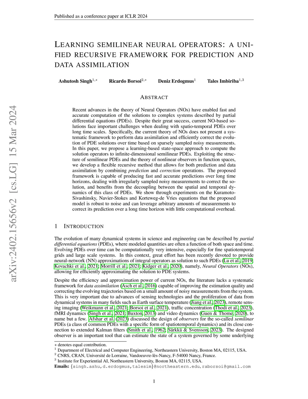 Recent advances in the theory of Neural Operators (NOs) have enabled fast and accurate computation of the solutions to complex systems described by partial differential equations (PDEs). Despite their great success, current NO-based solutions face important challenges when dealing with spatio-temporal PDEs over long time scales. Specifically, the current theory of NOs does not present a systematic framework to perform data assimilation and efficiently correct the evolution of PDE solutions over time based on sparsely sampled noisy measurements. In this paper, we propose a learning-based state-space approach to compute the solution operators to infinite-dimensional semilinear PDEs. Exploiting the structure of semilinear PDEs and the theory of nonlinear observers in function spaces, we develop a flexible recursive method that allows for both prediction and data assimilation by combining prediction and correction operations. The proposed framework is capable of producing fast and accurate predictions over long time horizons, dealing with irregularly sampled noisy measurements to correct the solution, and benefits from the decoupling between the spatial and temporal dynamics of this class of PDEs. We show through experiments on the Kuramoto-Sivashinsky, Navier-Stokes and Korteweg-de Vries equations that the proposed model is robust to noise and can leverage arbitrary amounts of measurements to correct its prediction over a long time horizon with little computational overhead.