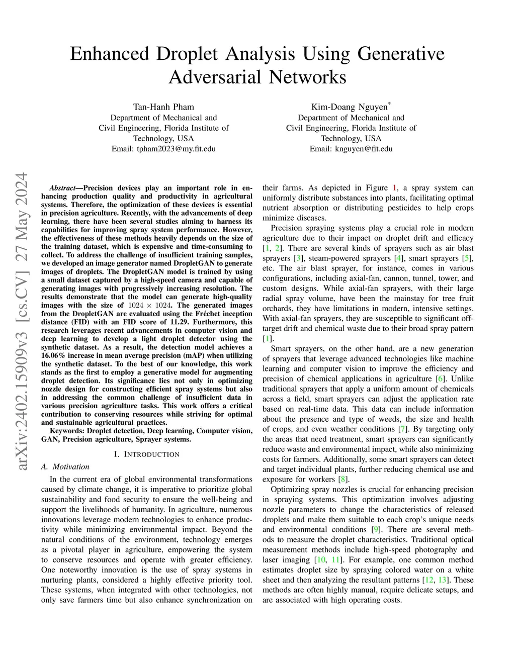 Precision devices play an important role in enhancing production quality and productivity in agricultural systems. Therefore, the optimization of these devices is essential in precision agriculture. Recently, with the advancements of deep learning, there have been several studies aiming to harness its capabilities for improving spray system performance. However, the effectiveness of these methods heavily depends on the size of the training dataset, which is expensive and time-consuming to collect. To address the challenge of insufficient training samples, we developed an image generator named DropletGAN to generate images of droplets. The DropletGAN model is trained by using a small dataset captured by a high-speed camera and capable of generating images with progressively increasing resolution. The results demonstrate that the model can generate high-quality images with the size of 1024x1024. The generated images from the DropletGAN are evaluated using the Fr\échet inception distance (FID) with an FID score of 11.29. Furthermore, this research leverages recent advancements in computer vision and deep learning to develop a light droplet detector using the synthetic dataset. As a result, the detection model achieves a 16.06% increase in mean average precision (mAP) when utilizing the synthetic dataset. To the best of our knowledge, this work stands as the first to employ a generative model for augmenting droplet detection. Its significance lies not only in optimizing nozzle design for constructing efficient spray systems but also in addressing the common challenge of insufficient data in various precision agriculture tasks. This work offers a critical contribution to conserving resources while striving for optimal and sustainable agricultural practices.