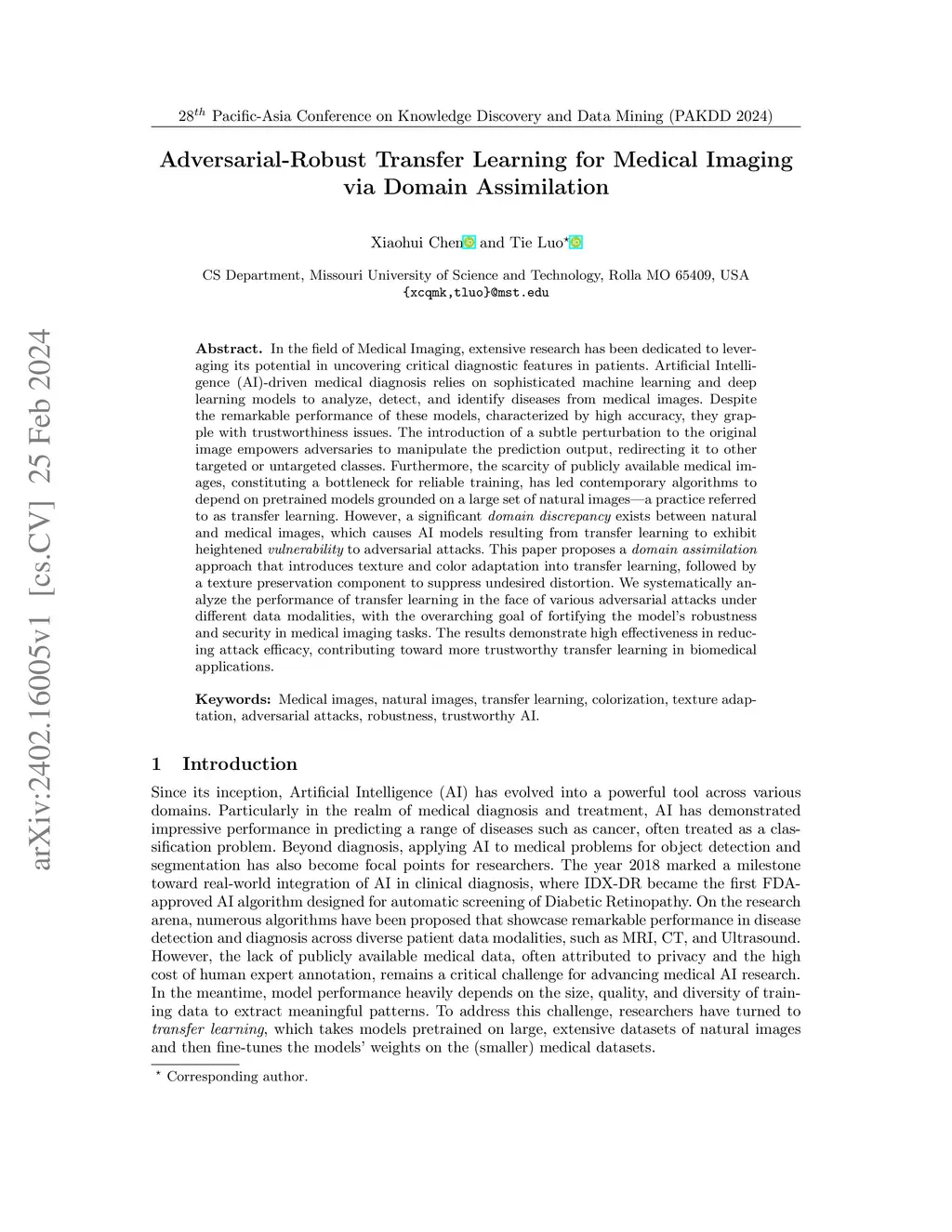 In the field of Medical Imaging, extensive research has been dedicated to leveraging its potential in uncovering critical diagnostic features in patients. Artificial Intelligence (AI)-driven medical diagnosis relies on sophisticated machine learning and deep learning models to analyze, detect, and identify diseases from medical images. Despite the remarkable performance of these models, characterized by high accuracy, they grapple with trustworthiness issues. The introduction of a subtle perturbation to the original image empowers adversaries to manipulate the prediction output, redirecting it to other targeted or untargeted classes. Furthermore, the scarcity of publicly available medical images, constituting a bottleneck for reliable training, has led contemporary algorithms to depend on pretrained models grounded on a large set of natural images -- a practice referred to as transfer learning. However, a significant {\em domain discrepancy} exists between natural and medical images, which causes AI models resulting from transfer learning to exhibit heightened {\em vulnerability} to adversarial attacks. This paper proposes a {\em domain assimilation} approach that introduces texture and color adaptation into transfer learning, followed by a texture preservation component to suppress undesired distortion. We systematically analyze the performance of transfer learning in the face of various adversarial attacks under different data modalities, with the overarching goal of fortifying the model's robustness and security in medical imaging tasks. The results demonstrate high effectiveness in reducing attack efficacy, contributing toward more trustworthy transfer learning in biomedical applications.