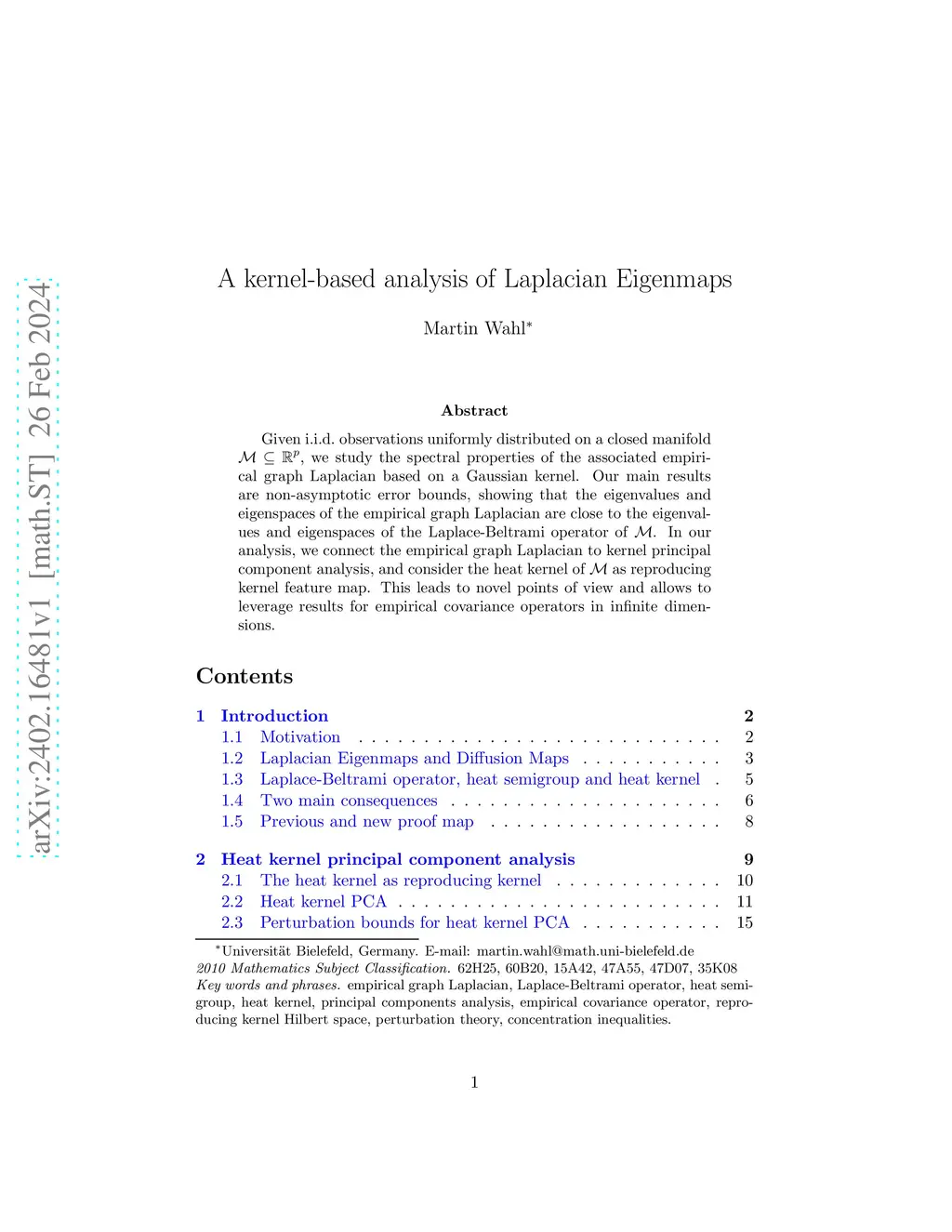 Given i.i.d. observations uniformly distributed on a closed manifold , we study the spectral properties of the associated empirical graph Laplacian based on a Gaussian kernel. Our main results are non-asymptotic error bounds, showing that the eigenvalues and eigenspaces of the empirical graph Laplacian are close to the eigenvalues and eigenspaces of the Laplace-Beltrami operator of . In our analysis, we connect the empirical graph Laplacian to kernel principal component analysis, and consider the heat kernel of as reproducing kernel feature map. This leads to novel points of view and allows to leverage results for empirical covariance operators in infinite dimensions.