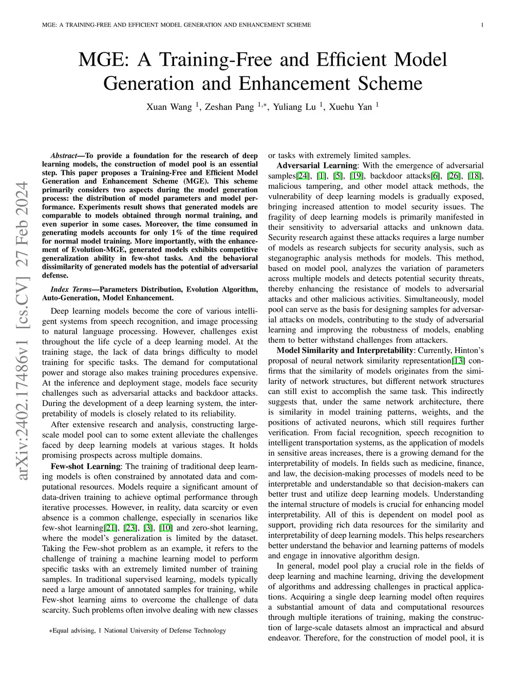 To provide a foundation for the research of deep learning models, the construction of model pool is an essential step. This paper proposes a Training-Free and Efficient Model Generation and Enhancement Scheme (MGE). This scheme primarily considers two aspects during the model generation process: the distribution of model parameters and model performance. Experiments result shows that generated models are comparable to models obtained through normal training, and even superior in some cases. Moreover, the time consumed in generating models accounts for only 1\% of the time required for normal model training. More importantly, with the enhancement of Evolution-MGE, generated models exhibits competitive generalization ability in few-shot tasks. And the behavioral dissimilarity of generated models has the potential of adversarial defense.