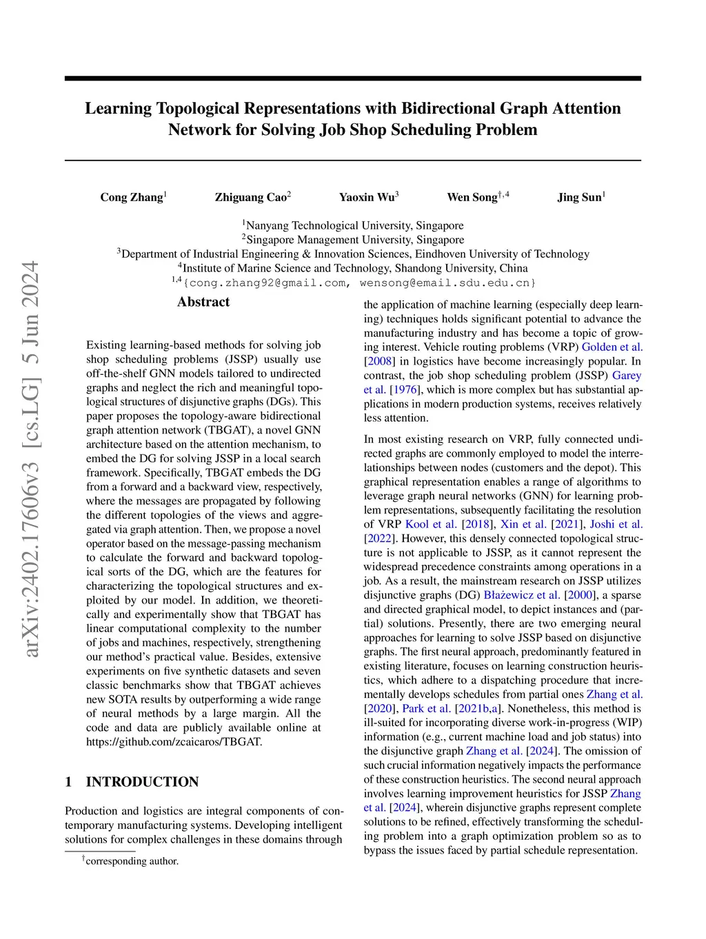 Existing learning-based methods for solving job shop scheduling problems (JSSP) usually use off-the-shelf GNN models tailored to undirected graphs and neglect the rich and meaningful topological structures of disjunctive graphs (DGs). This paper proposes the topology-aware bidirectional graph attention network (TBGAT), a novel GNN architecture based on the attention mechanism, to embed the DG for solving JSSP in a local search framework. Specifically, TBGAT embeds the DG from a forward and a backward view, respectively, where the messages are propagated by following the different topologies of the views and aggregated via graph attention. Then, we propose a novel operator based on the message-passing mechanism to calculate the forward and backward topological sorts of the DG, which are the features for characterizing the topological structures and exploited by our model. In addition, we theoretically and experimentally show that TBGAT has linear computational complexity to the number of jobs and machines, respectively, strengthening our method's practical value. Besides, extensive experiments on five synthetic datasets and seven classic benchmarks show that TBGAT achieves new SOTA results by outperforming a wide range of neural methods by a large margin. All the code and data are publicly available online at https://github.com/zcaicaros/TBGAT.
