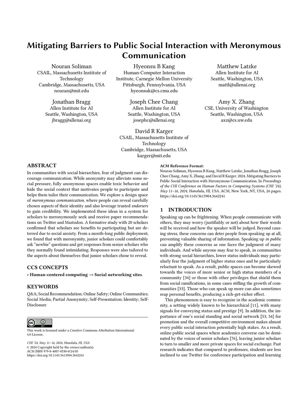 In communities with social hierarchies, fear of judgment can discourage communication. While anonymity may alleviate some social pressure, fully anonymous spaces enable toxic behavior and hide the social context that motivates people to participate and helps them tailor their communication. We explore a design space of meronymous communication, where people can reveal carefully chosen aspects of their identity and also leverage trusted endorsers to gain credibility. We implemented these ideas in a system for scholars to meronymously seek and receive paper recommendations on Twitter and Mastodon. A formative study with 20 scholars confirmed that scholars see benefits to participating but are deterred due to social anxiety. From a month-long public deployment, we found that with meronymity, junior scholars could comfortably ask ``newbie'' questions and get responses from senior scholars who they normally found intimidating. Responses were also tailored to the aspects about themselves that junior scholars chose to reveal.