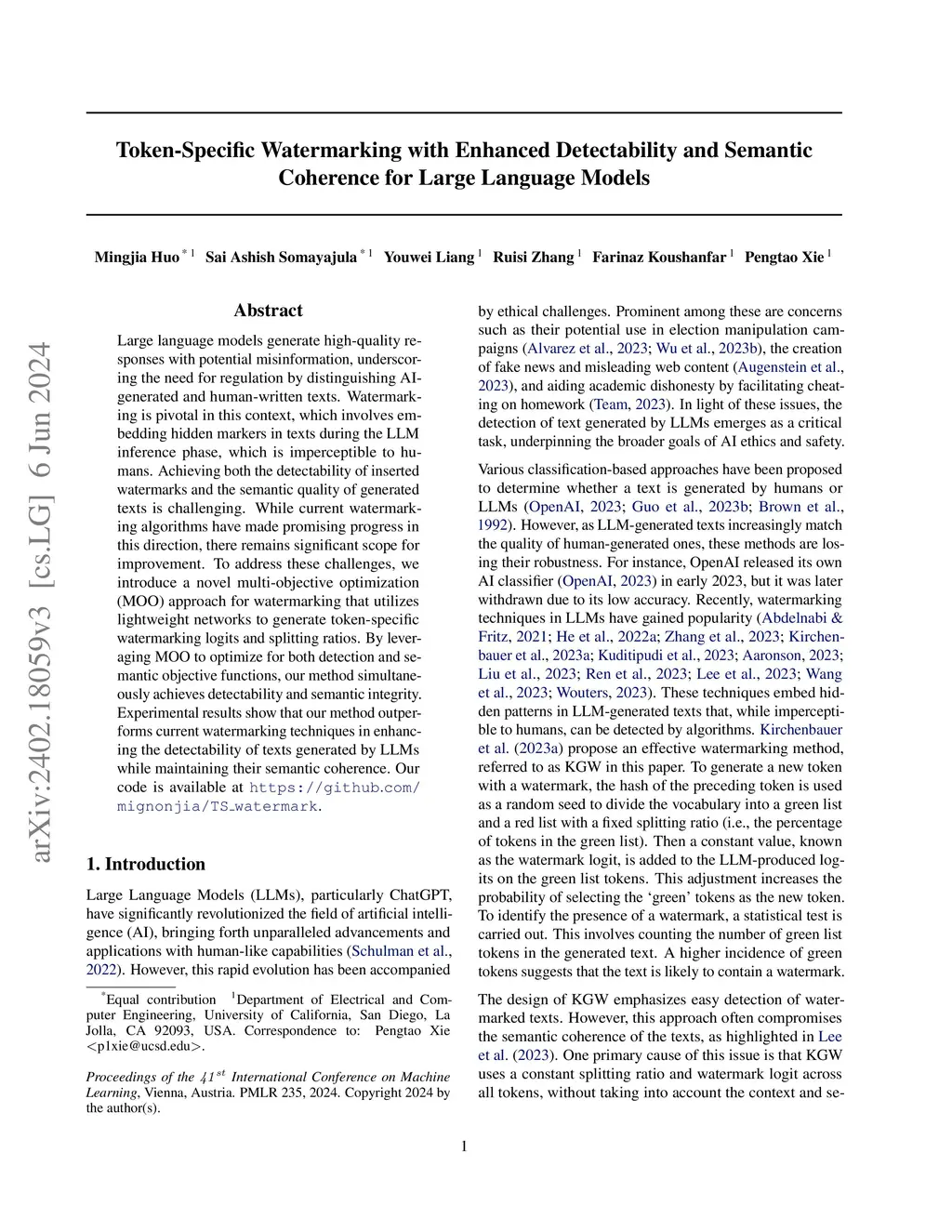 Large language models generate high-quality responses with potential misinformation, underscoring the need for regulation by distinguishing AI-generated and human-written texts. Watermarking is pivotal in this context, which involves embedding hidden markers in texts during the LLM inference phase, which is imperceptible to humans. Achieving both the detectability of inserted watermarks and the semantic quality of generated texts is challenging. While current watermarking algorithms have made promising progress in this direction, there remains significant scope for improvement. To address these challenges, we introduce a novel multi-objective optimization (MOO) approach for watermarking that utilizes lightweight networks to generate token-specific watermarking logits and splitting ratios. By leveraging MOO to optimize for both detection and semantic objective functions, our method simultaneously achieves detectability and semantic integrity. Experimental results show that our method outperforms current watermarking techniques in enhancing the detectability of texts generated by LLMs while maintaining their semantic coherence. Our code is available at https://github.com/mignonjia/TS_watermark.