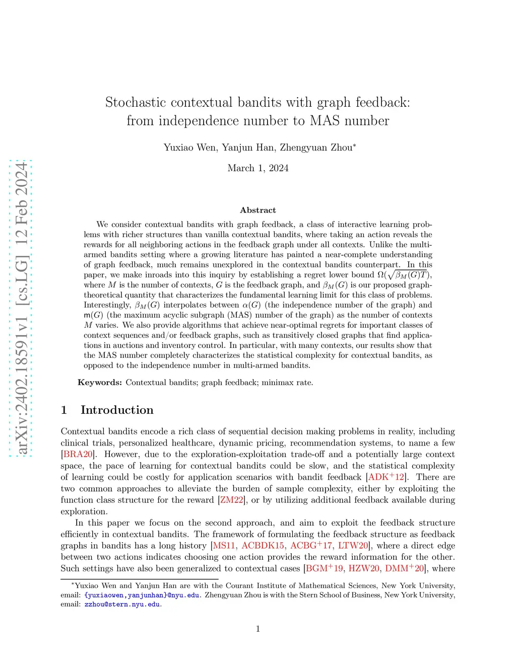 We consider contextual bandits with graph feedback, a class of interactive learning problems with richer structures than vanilla contextual bandits, where taking an action reveals the rewards for all neighboring actions in the feedback graph under all contexts. Unlike the multi-armed bandits setting where a growing literature has painted a near-complete understanding of graph feedback, much remains unexplored in the contextual bandits counterpart. In this paper, we make inroads into this inquiry by establishing a regret lower bound , where is the number of contexts, is the feedback graph, and is our proposed graph-theoretical quantity that characterizes the fundamental learning limit for this class of problems. Interestingly, interpolates between (the independence number of the graph) and (the maximum acyclic subgraph (MAS) number of the graph) as the number of contexts varies. We also provide algorithms that achieve near-optimal regrets for important classes of context sequences and/or feedback graphs, such as transitively closed graphs that find applications in auctions and inventory control. In particular, with many contexts, our results show that the MAS number completely characterizes the statistical complexity for contextual bandits, as opposed to the independence number in multi-armed bandits.