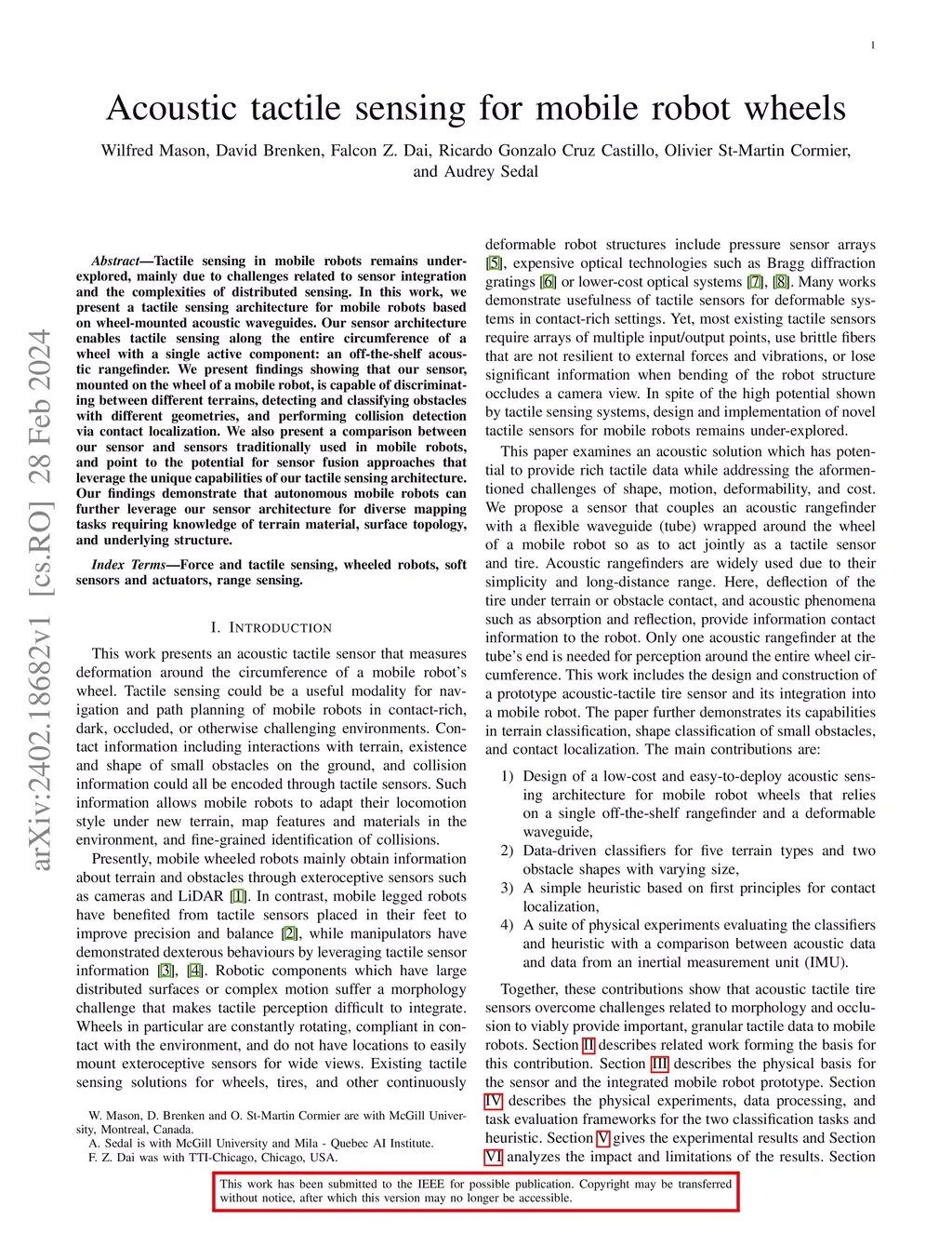 Tactile sensing in mobile robots remains under-explored, mainly due to challenges related to sensor integration and the complexities of distributed sensing. In this work, we present a tactile sensing architecture for mobile robots based on wheel-mounted acoustic waveguides. Our sensor architecture enables tactile sensing along the entire circumference of a wheel with a single active component: an off-the-shelf acoustic rangefinder. We present findings showing that our sensor, mounted on the wheel of a mobile robot, is capable of discriminating between different terrains, detecting and classifying obstacles with different geometries, and performing collision detection via contact localization. We also present a comparison between our sensor and sensors traditionally used in mobile robots, and point to the potential for sensor fusion approaches that leverage the unique capabilities of our tactile sensing architecture. Our findings demonstrate that autonomous mobile robots can further leverage our sensor architecture for diverse mapping tasks requiring knowledge of terrain material, surface topology, and underlying structure.