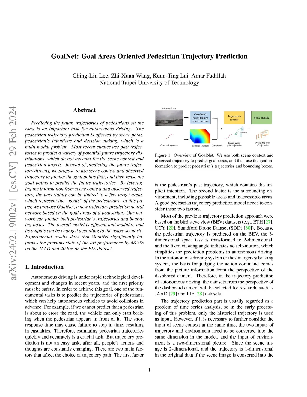 Predicting the future trajectories of pedestrians on the road is an important task for autonomous driving. The pedestrian trajectory prediction is affected by scene paths, pedestrian's intentions and decision-making, which is a multi-modal problem. Most recent studies use past trajectories to predict a variety of potential future trajectory distributions, which do not account for the scene context and pedestrian targets. Instead of predicting the future trajectory directly, we propose to use scene context and observed trajectory to predict the goal points first, and then reuse the goal points to predict the future trajectories. By leveraging the information from scene context and observed trajectory, the uncertainty can be limited to a few target areas, which represent the "goals" of the pedestrians. In this paper, we propose GoalNet, a new trajectory prediction neural network based on the goal areas of a pedestrian. Our network can predict both pedestrian's trajectories and bounding boxes. The overall model is efficient and modular, and its outputs can be changed according to the usage scenario. Experimental results show that GoalNet significantly improves the previous state-of-the-art performance by 48.7% on the JAAD and 40.8% on the PIE dataset.