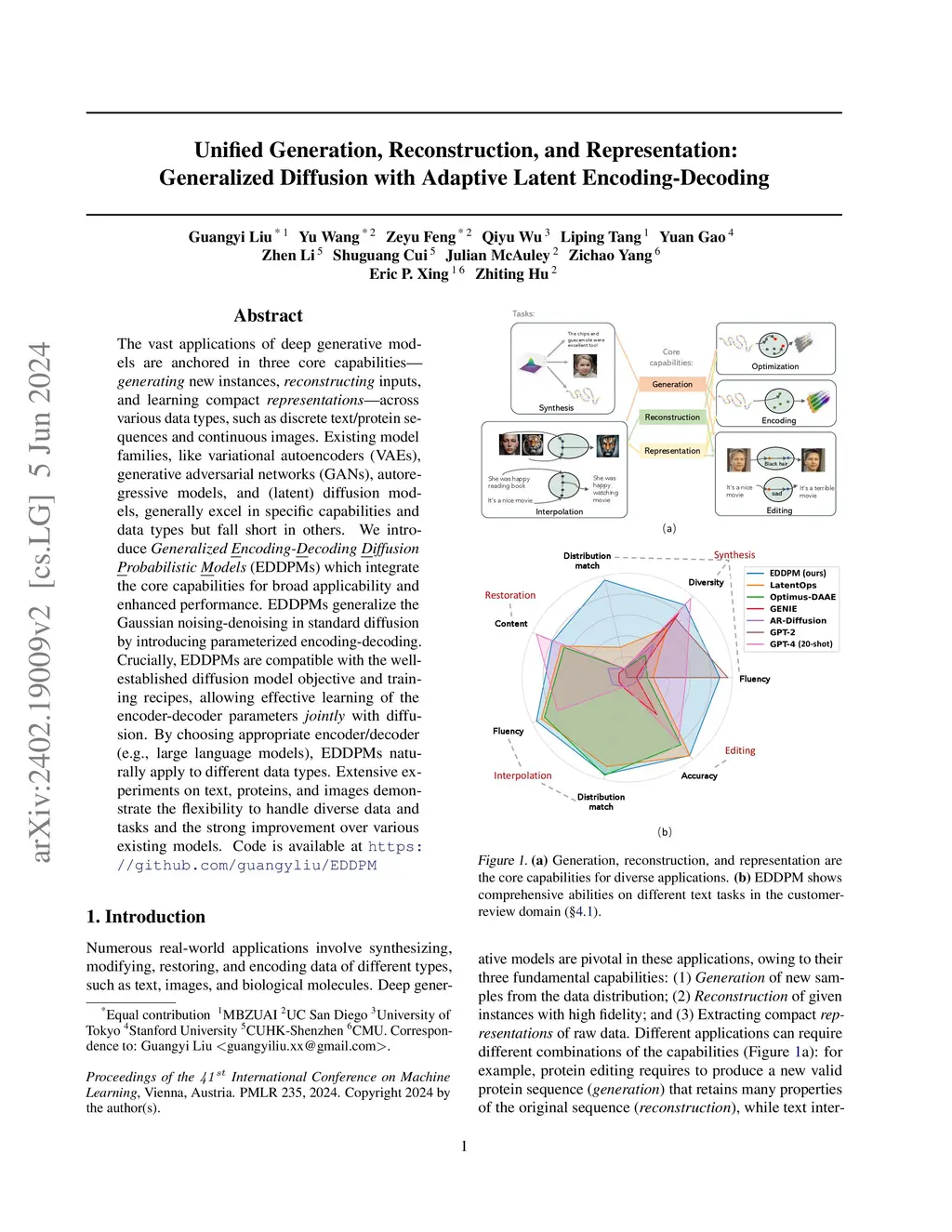 The vast applications of deep generative models are anchored in three core capabilities -- generating new instances, reconstructing inputs, and learning compact representations -- across various data types, such as discrete text/protein sequences and continuous images. Existing model families, like variational autoencoders (VAEs), generative adversarial networks (GANs), autoregressive models, and (latent) diffusion models, generally excel in specific capabilities and data types but fall short in others. We introduce Generalized Encoding-Decoding Diffusion Probabilistic Models (EDDPMs) which integrate the core capabilities for broad applicability and enhanced performance. EDDPMs generalize the Gaussian noising-denoising in standard diffusion by introducing parameterized encoding-decoding. Crucially, EDDPMs are compatible with the well-established diffusion model objective and training recipes, allowing effective learning of the encoder-decoder parameters jointly with diffusion. By choosing appropriate encoder/decoder (e.g., large language models), EDDPMs naturally apply to different data types. Extensive experiments on text, proteins, and images demonstrate the flexibility to handle diverse data and tasks and the strong improvement over various existing models.