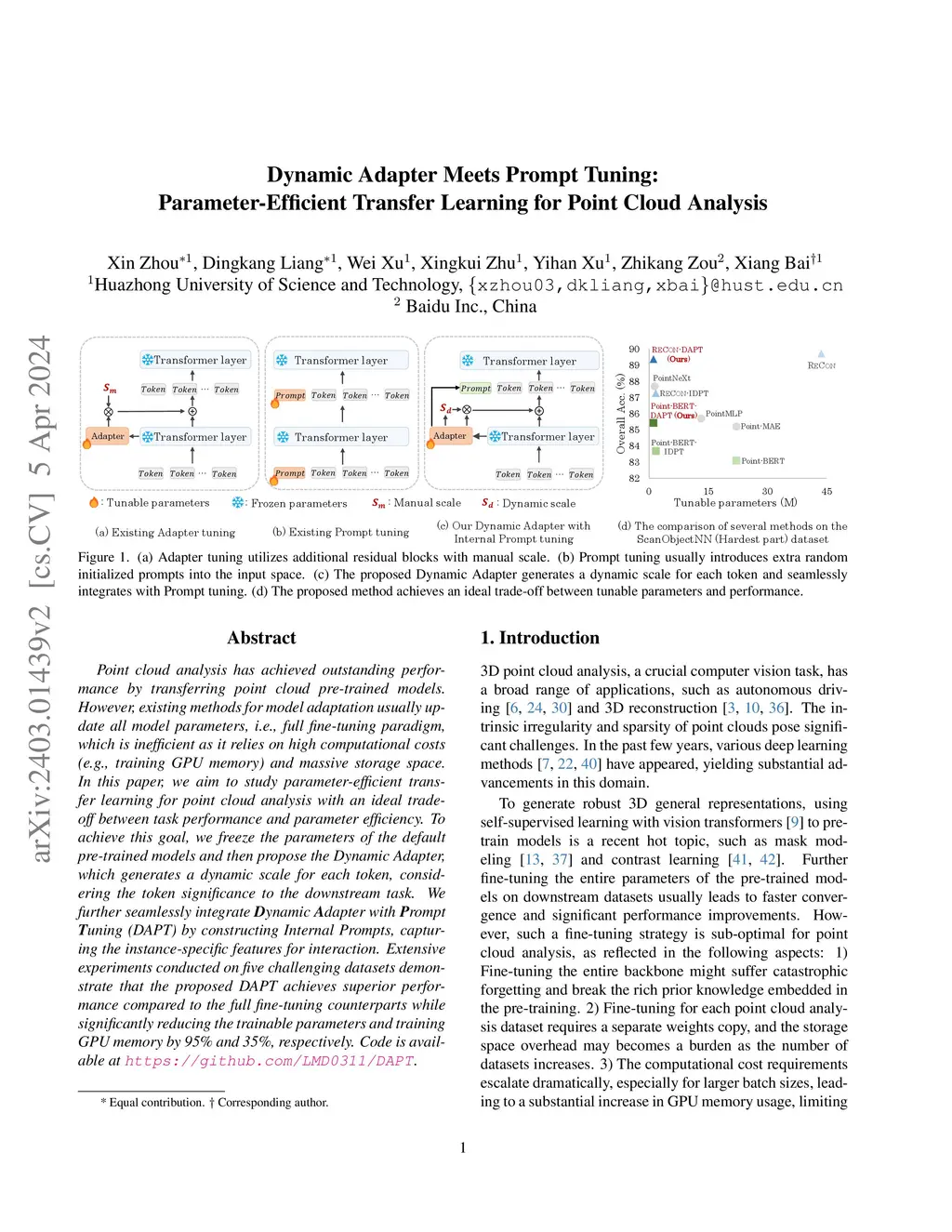 Point cloud analysis has achieved outstanding performance by transferring point cloud pre-trained models. However, existing methods for model adaptation usually update all model parameters, i.e., full fine-tuning paradigm, which is inefficient as it relies on high computational costs (e.g., training GPU memory) and massive storage space. In this paper, we aim to study parameter-efficient transfer learning for point cloud analysis with an ideal trade-off between task performance and parameter efficiency. To achieve this goal, we freeze the parameters of the default pre-trained models and then propose the Dynamic Adapter, which generates a dynamic scale for each token, considering the token significance to the downstream task. We further seamlessly integrate Dynamic Adapter with Prompt Tuning (DAPT) by constructing Internal Prompts, capturing the instance-specific features for interaction. Extensive experiments conducted on five challenging datasets demonstrate that the proposed DAPT achieves superior performance compared to the full fine-tuning counterparts while significantly reducing the trainable parameters and training GPU memory by 95% and 35%, respectively. Code is available at https://github.com/LMD0311/DAPT.
