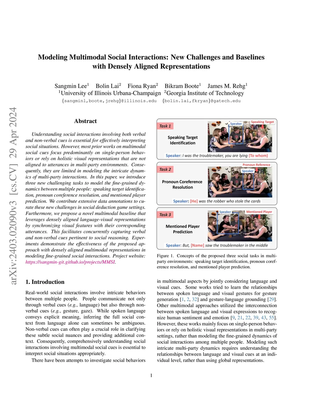 Understanding social interactions involving both verbal and non-verbal cues is essential for effectively interpreting social situations. However, most prior works on multimodal social cues focus predominantly on single-person behaviors or rely on holistic visual representations that are not aligned to utterances in multi-party environments. Consequently, they are limited in modeling the intricate dynamics of multi-party interactions. In this paper, we introduce three new challenging tasks to model the fine-grained dynamics between multiple people: speaking target identification, pronoun coreference resolution, and mentioned player prediction. We contribute extensive data annotations to curate these new challenges in social deduction game settings. Furthermore, we propose a novel multimodal baseline that leverages densely aligned language-visual representations by synchronizing visual features with their corresponding utterances. This facilitates concurrently capturing verbal and non-verbal cues pertinent to social reasoning. Experiments demonstrate the effectiveness of the proposed approach with densely aligned multimodal representations in modeling fine-grained social interactions. Project website: https://sangmin-git.github.io/projects/MMSI.