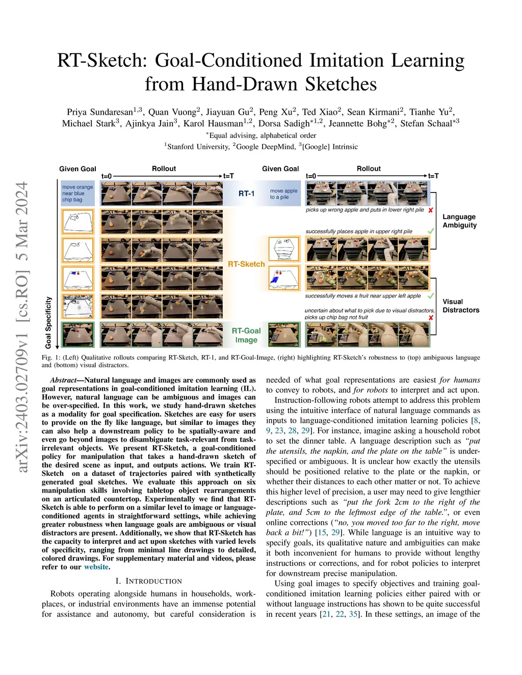 Natural language and images are commonly used as goal representations in goal-conditioned imitation learning (IL). However, natural language can be ambiguous and images can be over-specified. In this work, we propose hand-drawn sketches as a modality for goal specification in visual imitation learning. Sketches are easy for users to provide on the fly like language, but similar to images they can also help a downstream policy to be spatially-aware and even go beyond images to disambiguate task-relevant from task-irrelevant objects. We present RT-Sketch, a goal-conditioned policy for manipulation that takes a hand-drawn sketch of the desired scene as input, and outputs actions. We train RT-Sketch on a dataset of paired trajectories and corresponding synthetically generated goal sketches. We evaluate this approach on six manipulation skills involving tabletop object rearrangements on an articulated countertop. Experimentally we find that RT-Sketch is able to perform on a similar level to image or language-conditioned agents in straightforward settings, while achieving greater robustness when language goals are ambiguous or visual distractors are present. Additionally, we show that RT-Sketch has the capacity to interpret and act upon sketches with varied levels of specificity, ranging from minimal line drawings to detailed, colored drawings. For supplementary material and videos, please refer to our website: http://rt-sketch.github.io.