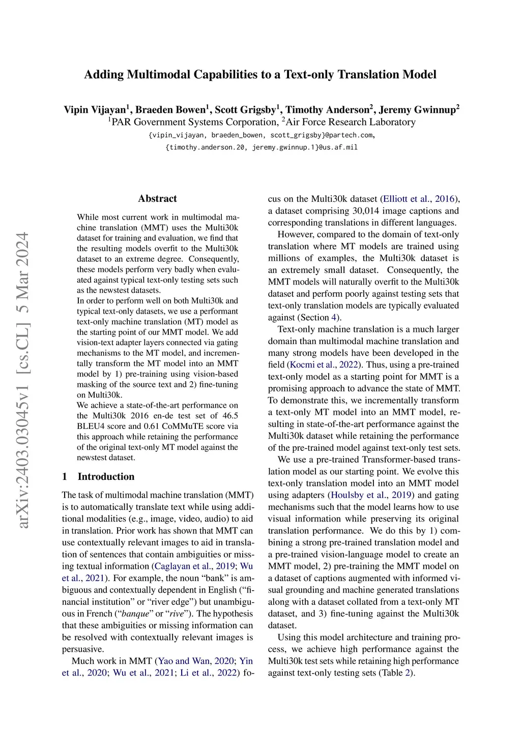 Adding Multimodal Capabilities to a Text-only Translation Model