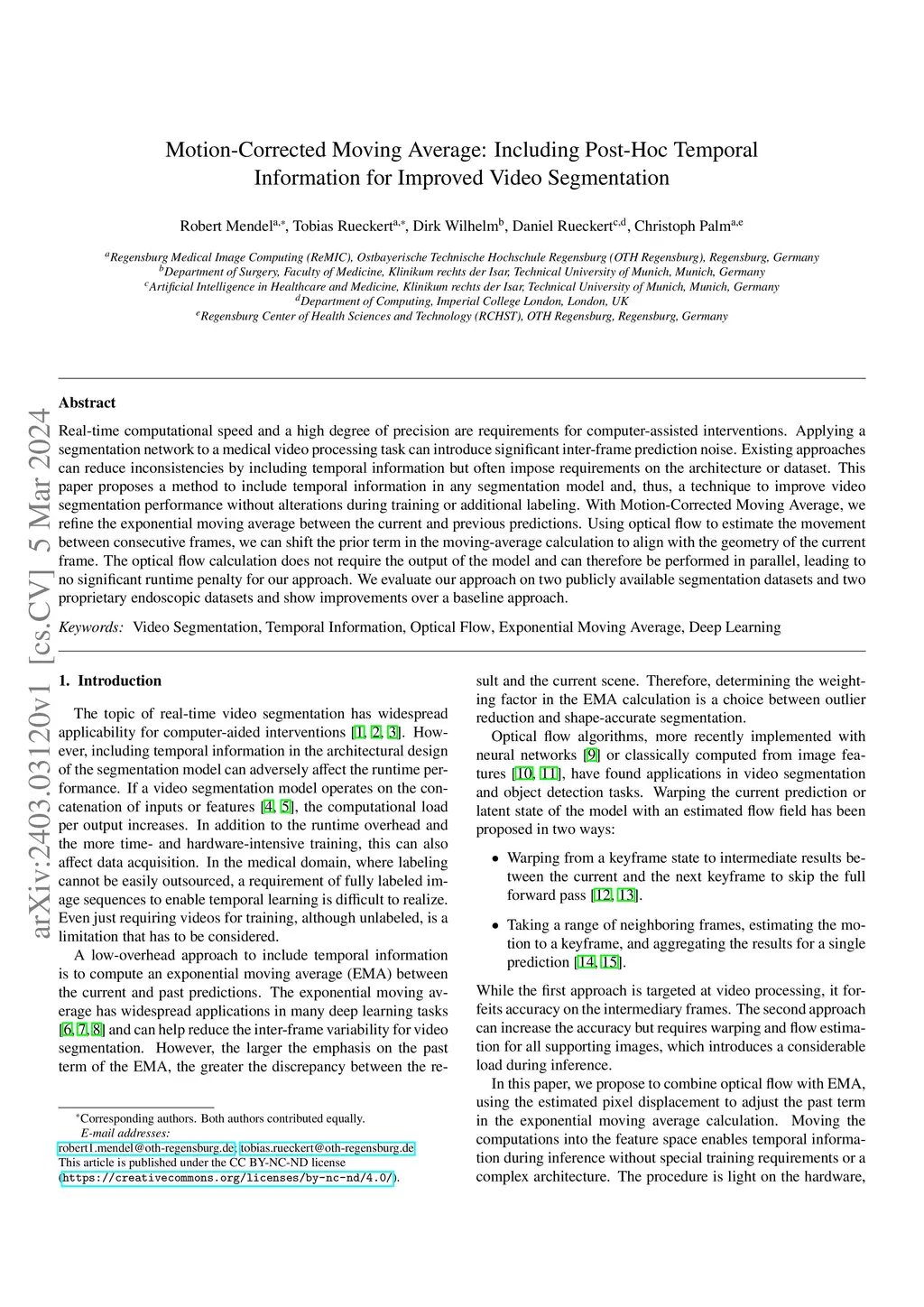 Real-time computational speed and a high degree of precision are requirements for computer-assisted interventions. Applying a segmentation network to a medical video processing task can introduce significant inter-frame prediction noise. Existing approaches can reduce inconsistencies by including temporal information but often impose requirements on the architecture or dataset. This paper proposes a method to include temporal information in any segmentation model and, thus, a technique to improve video segmentation performance without alterations during training or additional labeling. With Motion-Corrected Moving Average, we refine the exponential moving average between the current and previous predictions. Using optical flow to estimate the movement between consecutive frames, we can shift the prior term in the moving-average calculation to align with the geometry of the current frame. The optical flow calculation does not require the output of the model and can therefore be performed in parallel, leading to no significant runtime penalty for our approach. We evaluate our approach on two publicly available segmentation datasets and two proprietary endoscopic datasets and show improvements over a baseline approach.